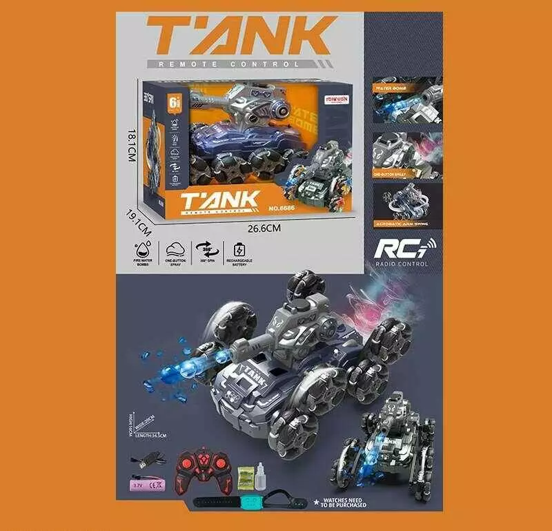 Танк на радіокеруванні 6689 (24) акумулятор 3.7 V, пульт 2.4 Ghz, браслет, підсвічування, парогенератор, стріляє орбізами, роликові колеса, в коробці