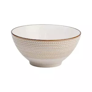 Тарілка має білий колір і прикрашена візерунком у вигляді шевронів.