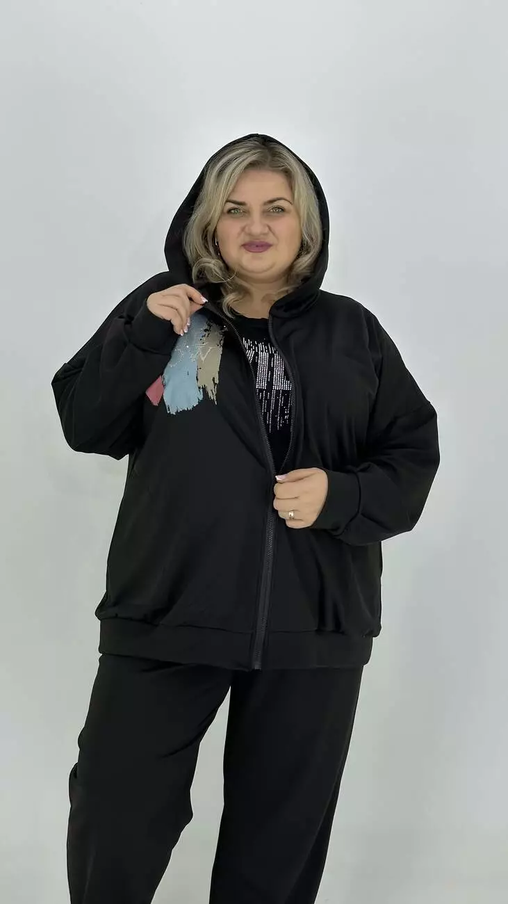 Спортивний костюм з еластичного трикотажу дайвінг, з начосом. Тканина дуже добре тягнеться, м'яка та приємна до тіла, тепла, не кашлатиться, не потребує особливого догляду. Кофта - подовжена з поясом, закриває стегна, внутрішні кишені від бокового шва. Оздоблена якісним накатом, фарба + каміння. Штани з високою посадкою, пояс на резинці, з кишенями дуже зручні.