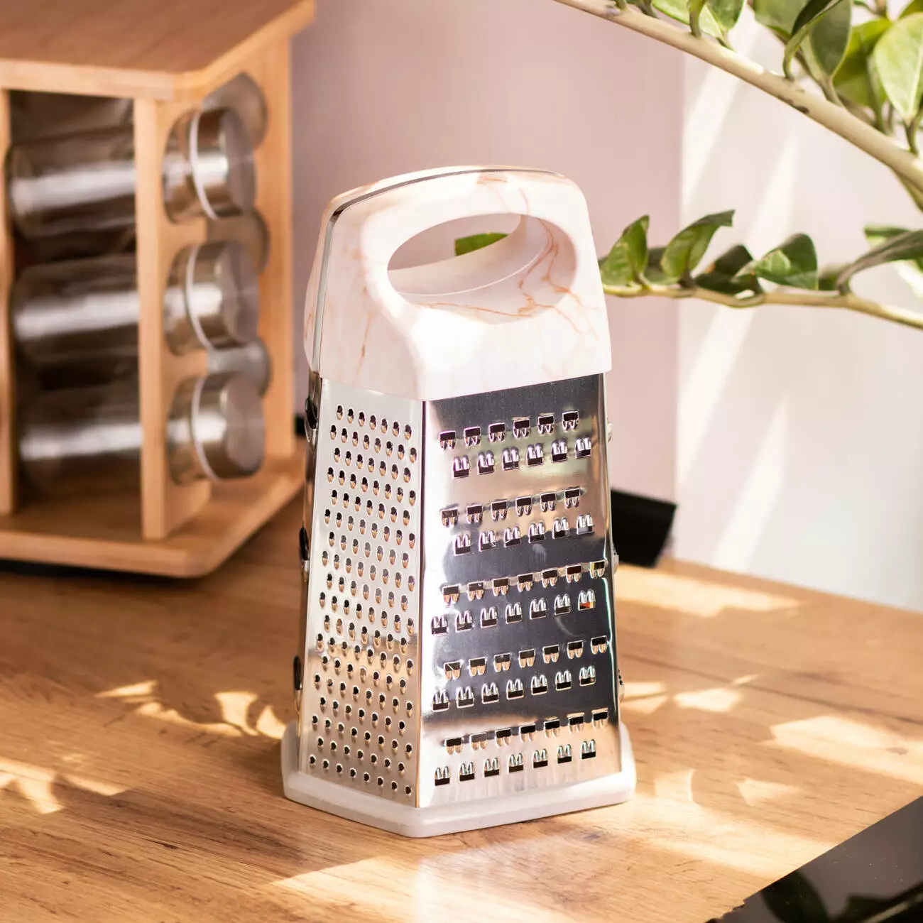 Шестикутна тертка — багатофункціональний інструмент для кухні, що поєднує шість різних робочих поверхонь. Кожна сторона має власний тип леза, завдяки чому можна натирати, подрібнювати або нарізати продукти різної текстури: овочі, сир, фрукти, шоколад тощо. Така конструкція дозволяє виконати кілька задач без зміни інструменту.