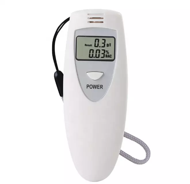 Алкотестер – это персональный тестер на алкоголь, который измеряет концентрацию алкоголя в выдыхаемом воздухе и помогает установить степень опьянения (промили) при помощи полупроводникового датчика. Алкометр тестирует содержание этилового спирта в организме человека и после завершения анализа загорается световой индикатор, соответствующий определенной степени опьянения: зеленый – безопасно, желтый – предупреждение, красный – опасно, красный и желтый вместе – значительное превышение. Алкотестер брелок указивает содержание алкоголя с точностью до 0.01 промиля, в зависимости от температуры окружающей среды и разновидности этанола. Процесс вычисления количества алкоголя может занимать от нескольких секунд до одной минуты. Цифровой алкотестер работает от 2 батареек типа ААА, оснащен фонариком и имеет кольцо для крепления.