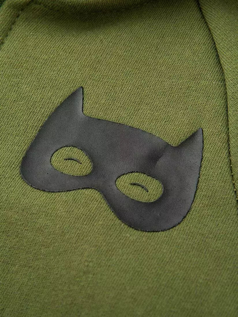 зеленого кольору. Глибокий чорний капюшон. Спереду застібка –