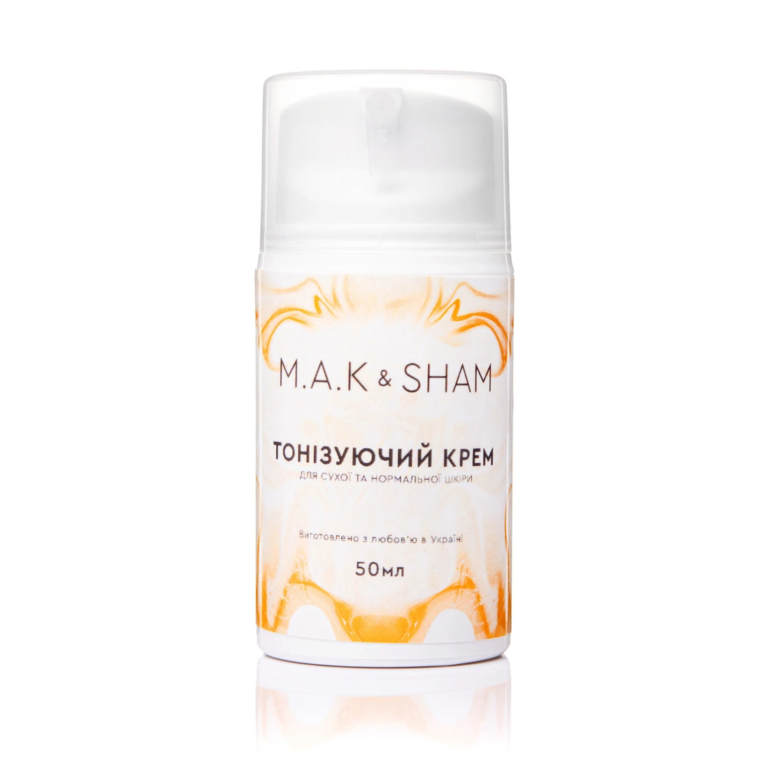 Тонізуючий крем для сухої і нормальної шкіри від MAKSHAM - натуральний засіб, що містить природні компоненти. У складі відсутні будь-які синтетичні складові та барвники.  Крем, що не тільки зволожує, а й збагачує шкіру корисними елементами.  Ефективний засіб для надмірно сухої шкіри  та  для нормального типу.