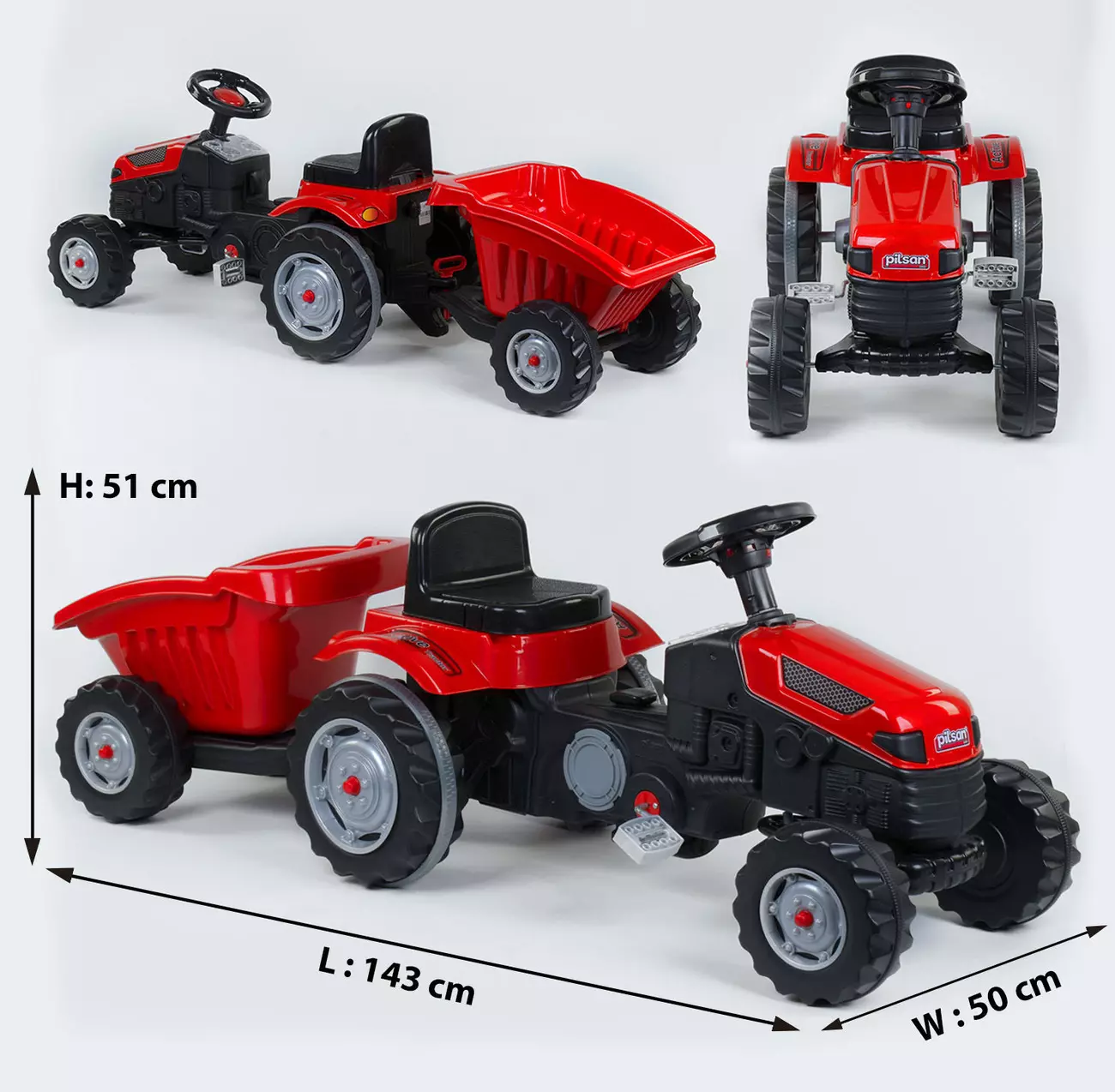 Веломобіль - Трактор - це поєднання Толокар і велосипеда. Дитина може крутити педалі і управляти трактором за допомогою керма. Трактор оснащений комфортним сидінням, яке має унікальне кріплення з 6-ма позиціями регулювання. Ланцюговий привід забезпечує зручність і плавність під час катання. Кермо машинки оснащений клаксоном. У комплекті з трактором йде причіп в такому ж кольорі, як і сам трактор. Комплектуючі веломобіля виготовлені з екологічних матеріалів, які не викликають алергію, не мають запаху і повністю безпечні для здоров'я дитини. Характеристики: Діаметр коліс: передні - 23 см, задні - 30 см. Тип сидіння - регульоване. Тип приводу - ланцюгової. Максимальне навантаження - 50 кг. Вага Нетто: 8 кг Маса Брутто: 9,5 кг