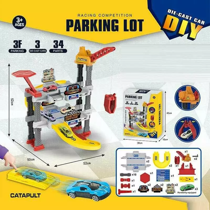 Трек 939-303 (30) парковка, 34 елементи, механічний підйомник, катапульта, 3 металопластикові машинки, в коробці