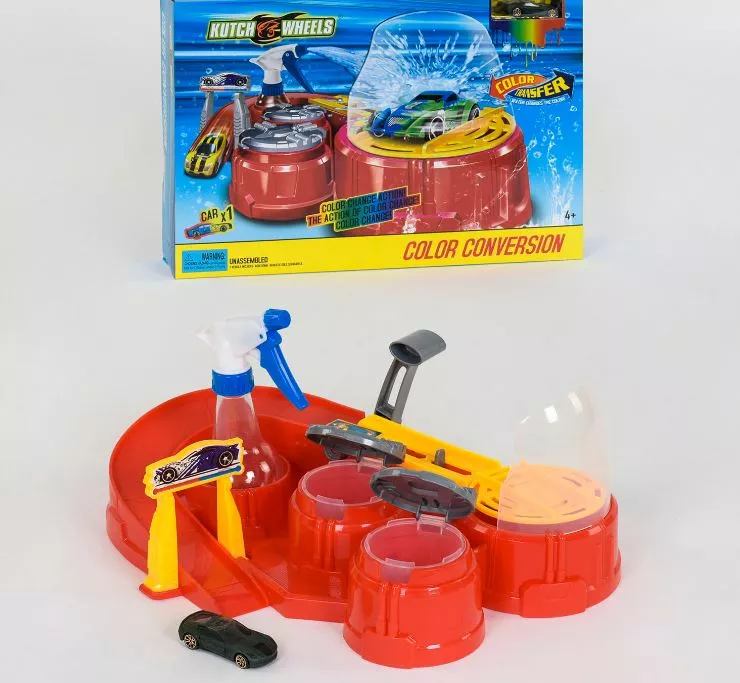 Збери свою власну майстерню для фарбування машин! Особливістю іграшки є можливість використання води в процесі гри. Гра складається з обертової поверхні з захисним екраном і водозбірником, а також з двох резервуарів для гарячої та холодної води та бластера-розпилювача. Потрапляючи на платформу, машинка може бути перефарбована в інші кольори за допомогою спеціального розпилювача води, які швидко перемикаються між двома резервуарами з водою. Трек стане улюбленою іграшкою юного гонщика і буде радувати його широким діапазоном ігрових можливостей У наборі: - деталі конструкції; - розпилювач; - машинка; - інструкція.