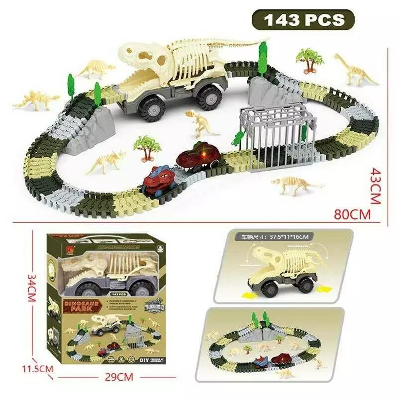 Трек P 921 (20) 3 машинки, підсвічування, муляжі оточення, фігурки динозаврів, в коробці