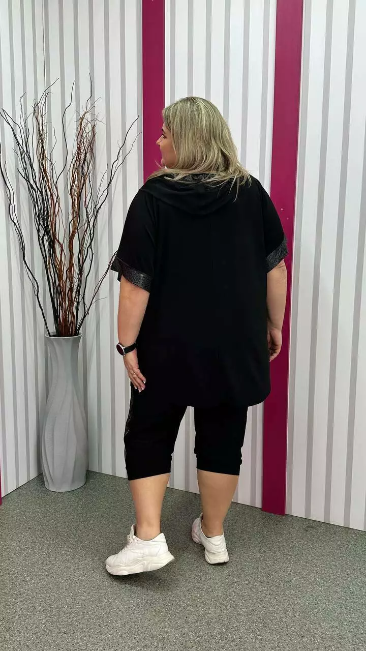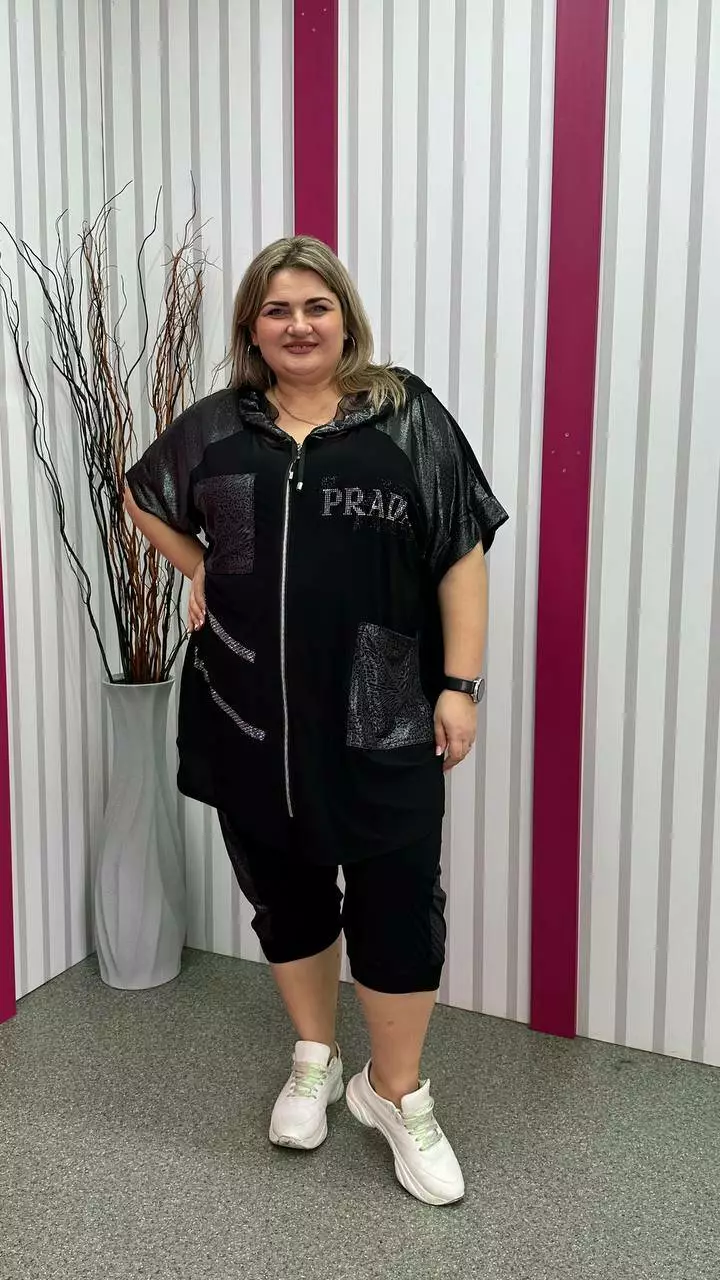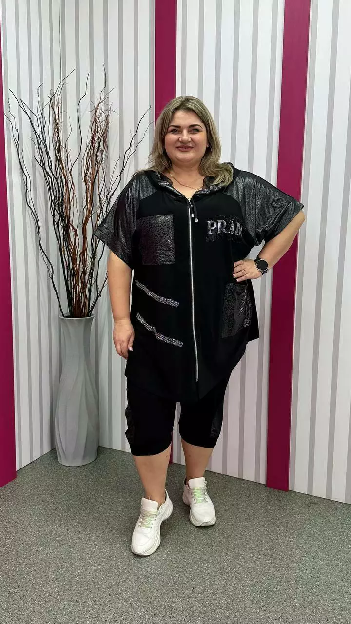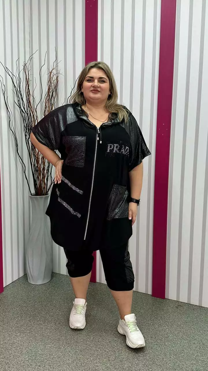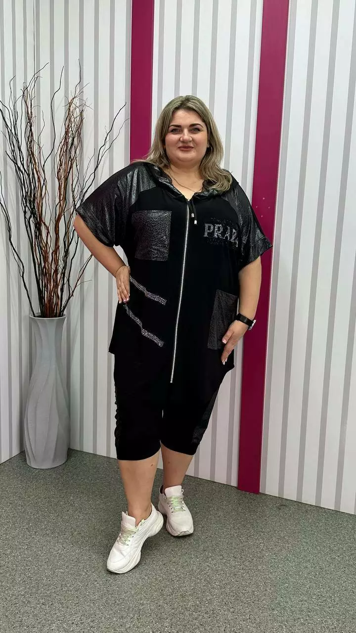 Костюм туніка+ капрі з корейської олії з дуже гарною розтяжністю. Тканина м'яка, легка, приємна до тіла, не мнеться. Туніка на змійці зі спущеним плечем із капюшоном та кишенями. Прикрашена якісним накатом з камінців