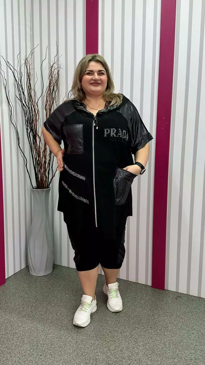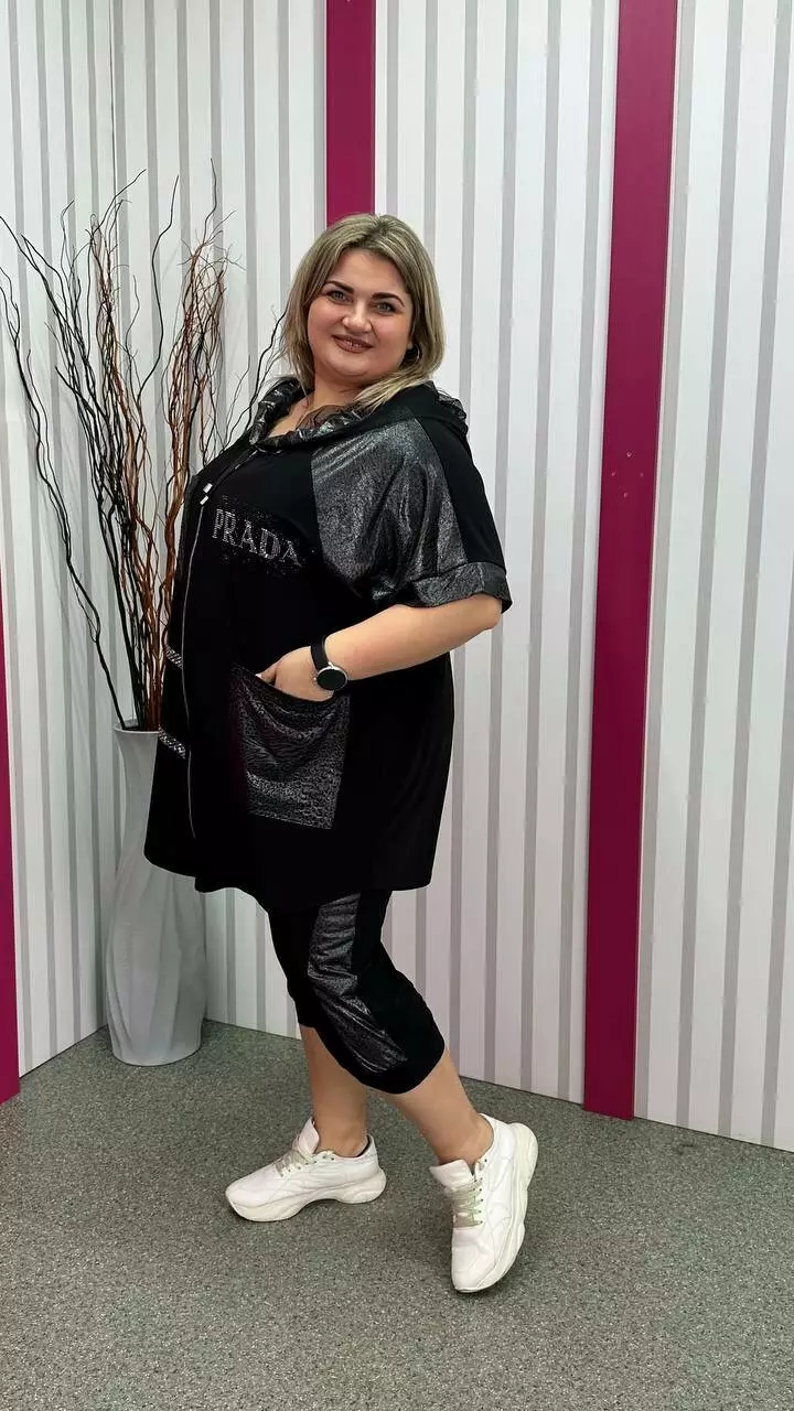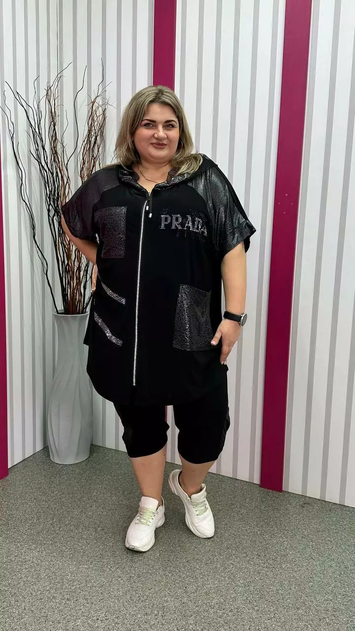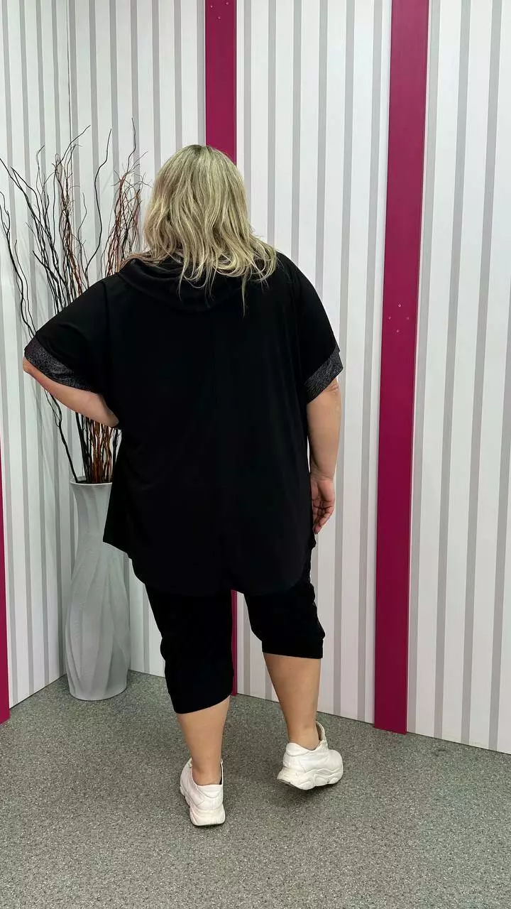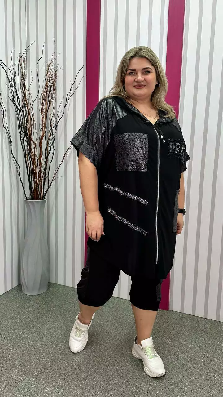 Костюм туніка+ капрі з корейської олії з дуже гарною розтяжністю. Тканина м'яка, легка, приємна до тіла, не мнеться. Туніка на змійці зі спущеним плечем із капюшоном та кишенями. Прикрашена якісним накатом з камінців