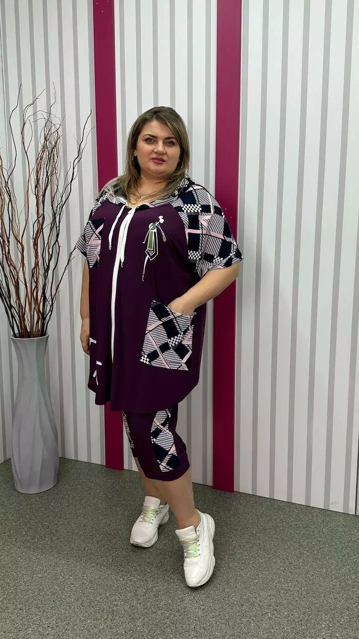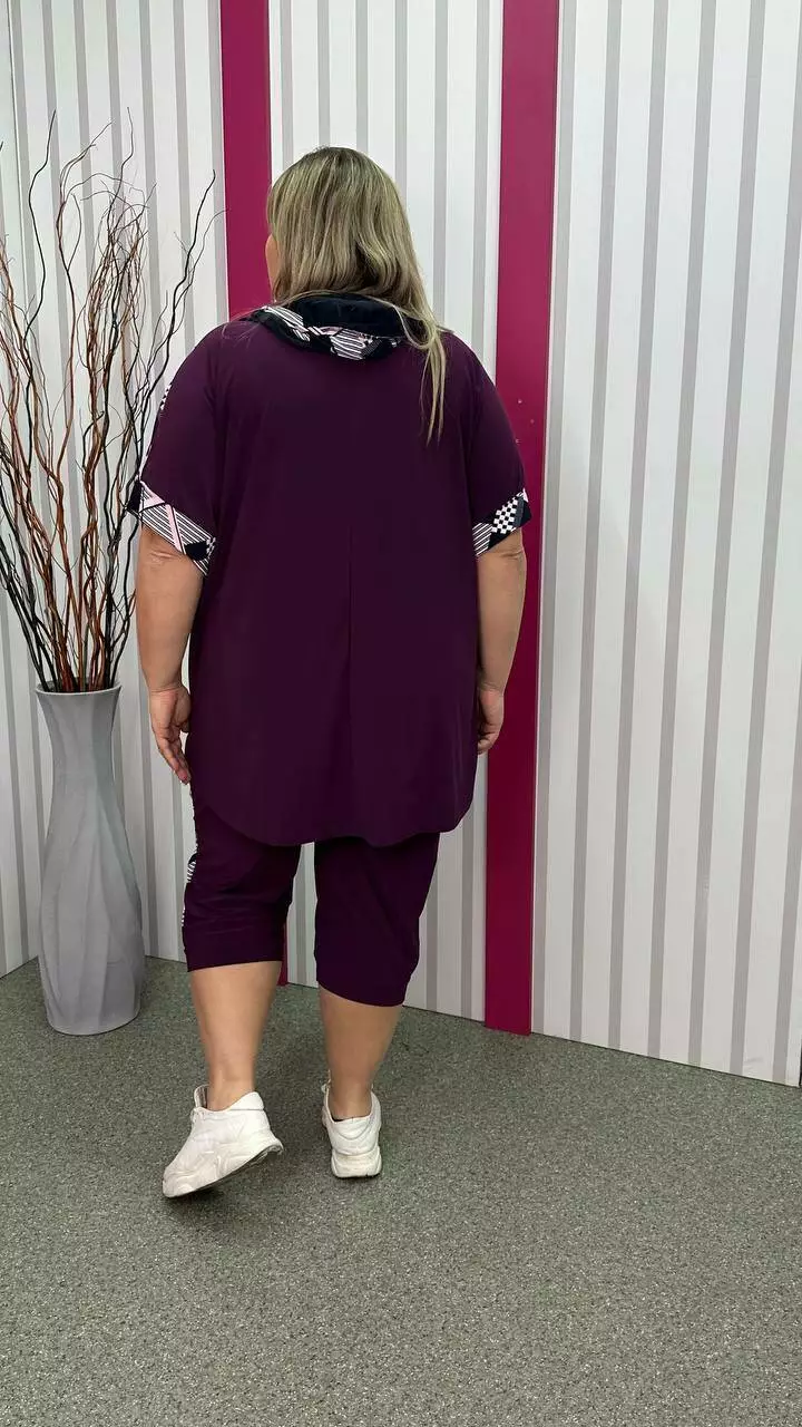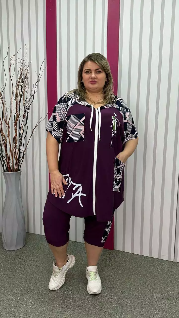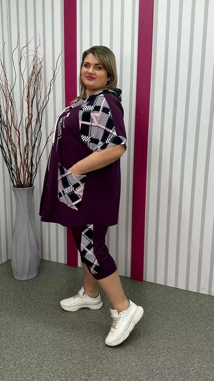 спущеним плечем із капюшоном та кишенями. Капрі широкі з