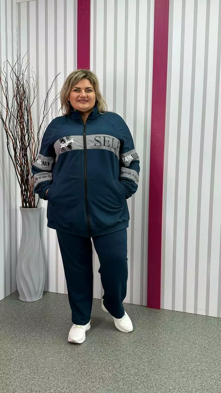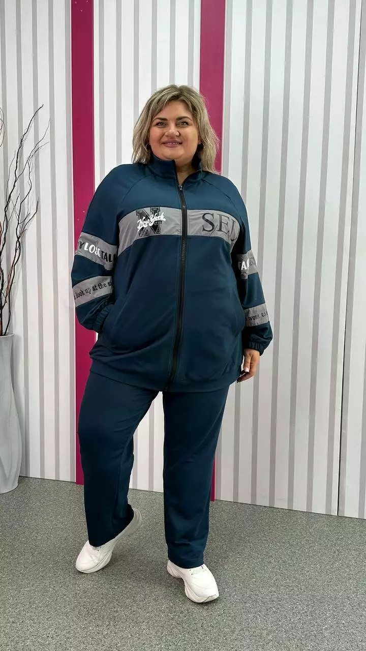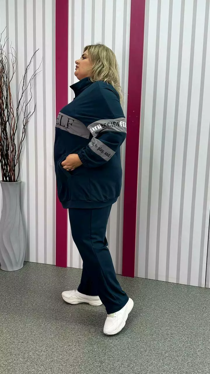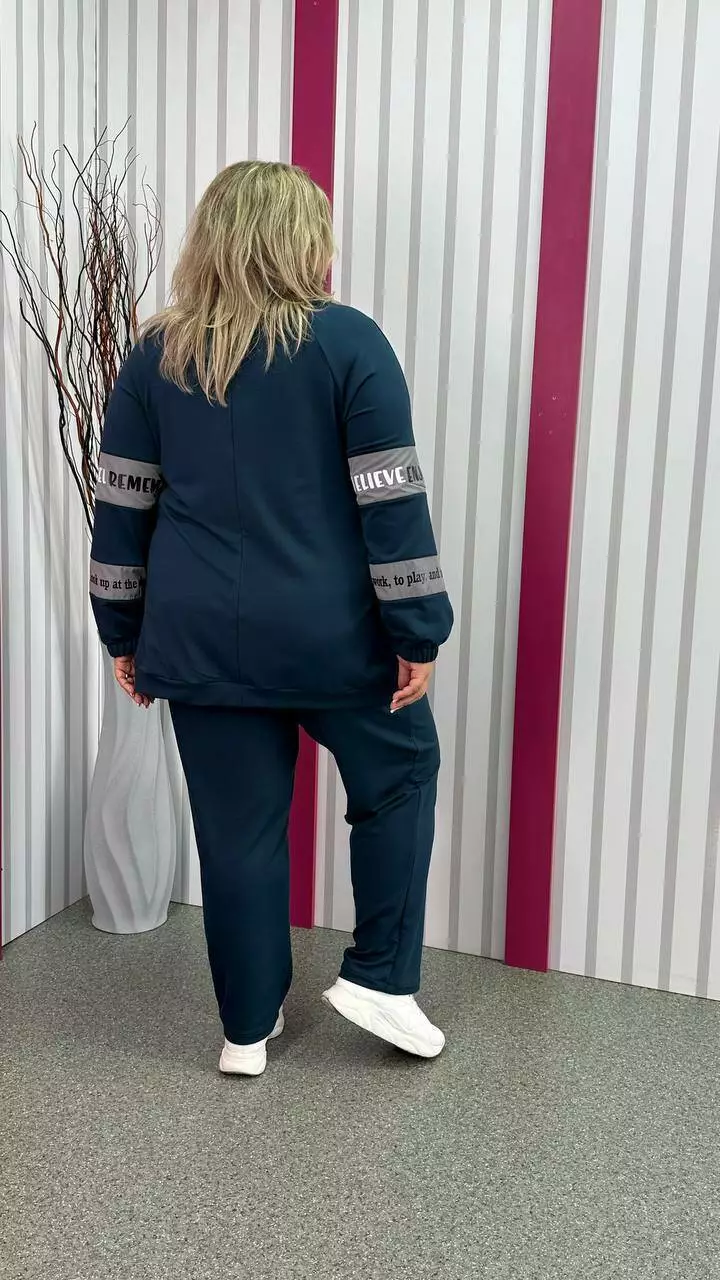 Повсякденний костюм із трикотажу двонитка з гарною розтяжністю, гарної якості. Тканина м'яка, приємна до тіла, не кашлатається. Прикрашений оздобленням із плащівки з якісним накатом. Кофта подовжена, внизу пояс, реглан рукав, низ на гумці. Комір стійка, кишені листочка. Штани з високою посадкою, пояс на резинці з кишенями.