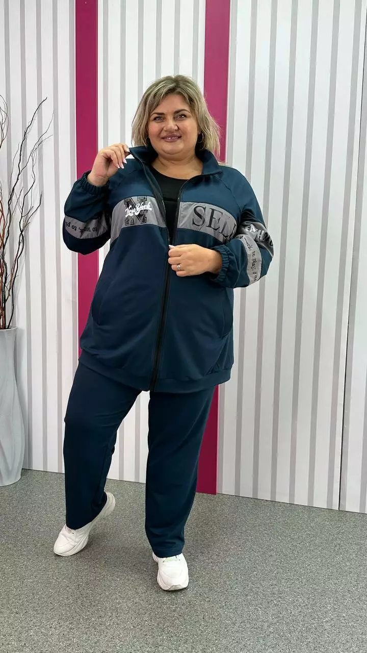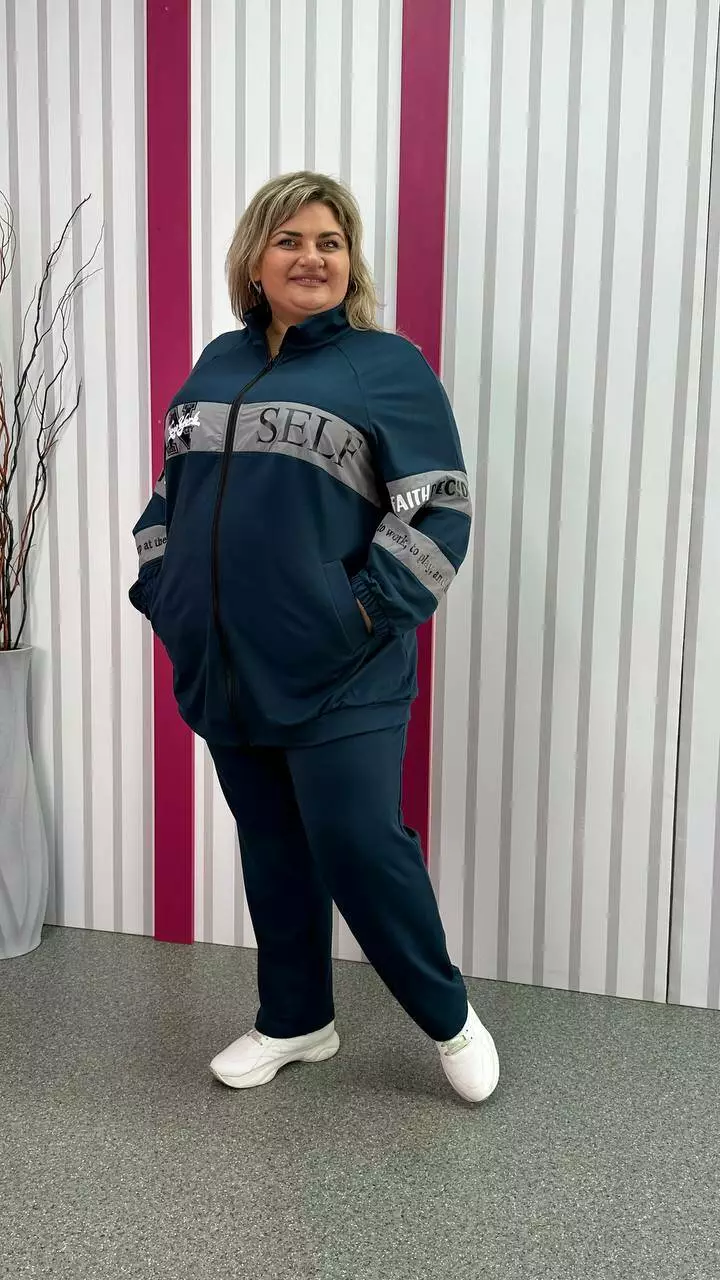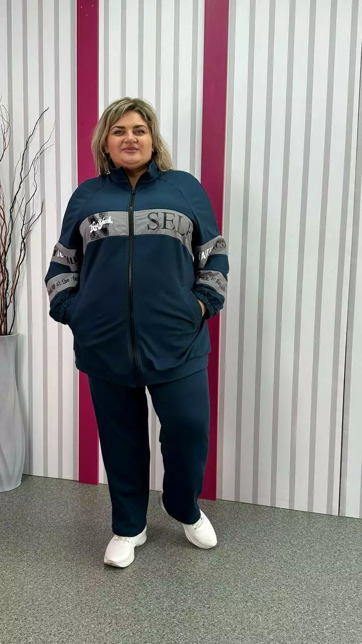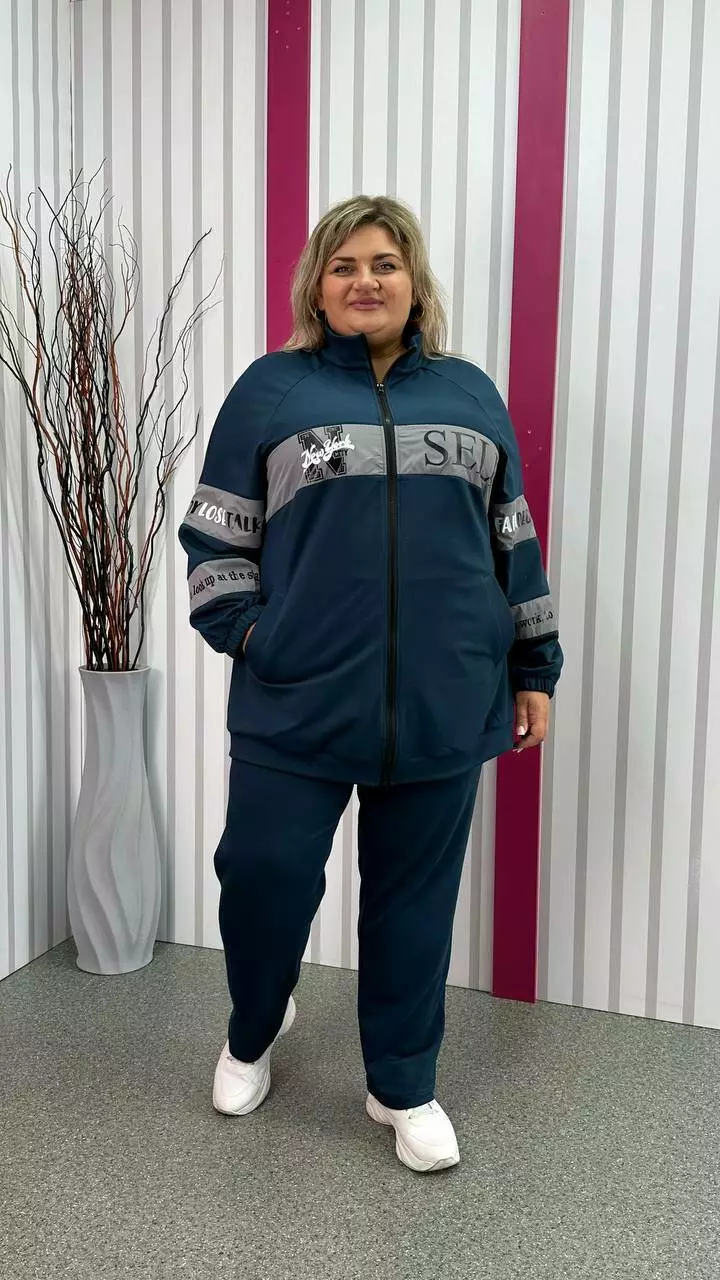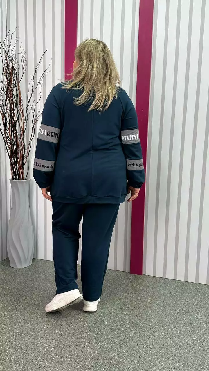 Повсякденний костюм із трикотажу двонитка з гарною розтяжністю, гарної якості. Тканина м'яка, приємна до тіла, не кашлатається. Прикрашений оздобленням із плащівки з якісним накатом. Кофта подовжена, внизу пояс, реглан рукав, низ на гумці. Комір стійка, кишені листочка. Штани з високою посадкою, пояс на резинці з кишенями.
