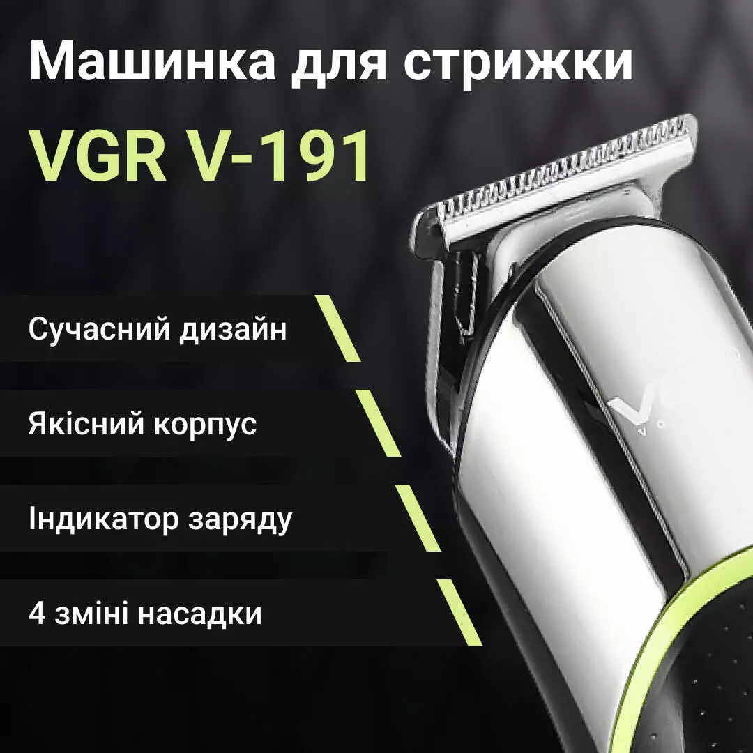 Багатофункціональний триммер VGR V-191 призначений для домашніх умов, а також для професійного використання в перукарнях, салонах краси, барбершопах. Модель відрізняється удароміцним суцільнометалевим корпусом, стійким до дії вібрації, низьким рівнем шуму, плавним ходом гострих лез, зручністю та тривалим терміном експлуатації.Універсальна модель має компактний та стильний дизайн, відмінну ергономіку, невелику вагу та оптимальну потужність.