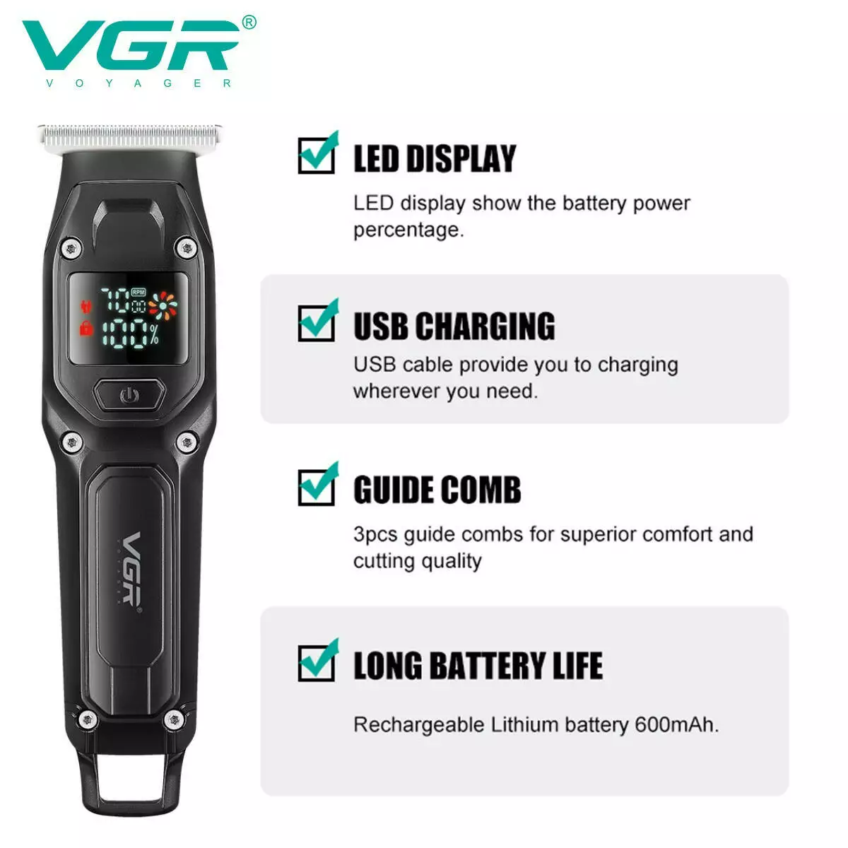 Акумуляторний триммер VGR V-964 - універсальний прилад для стрижки волосся, вусів та бороди. Він поєднує функціональність, зручність у використанні та сучасний дизайн, забезпечуючи рівний зріз та акуратний результат. LED-дисплей відображає рівень заряду акумулятора та стан роботи, що робить експлуатацію зручнішою та інформативною. Ергономічний корпус добре лежить у руці, а потужний мотор із високою швидкістю забезпечує стабільну роботу без ривків та заїдань.
