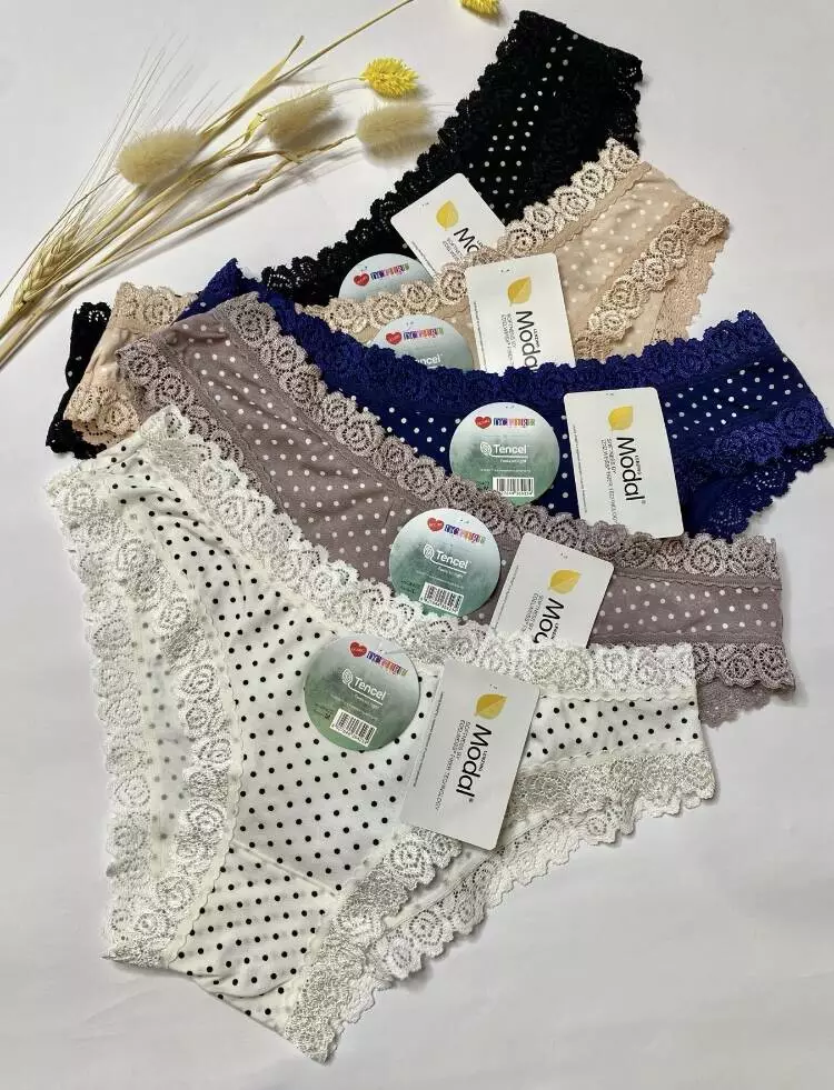 Жіночі трусики із мякого модалу.Гарні приглушені кольори,прикрашені кружевом. В упаковці 12 шт. різних кольорів (зразки кольорів на фото)