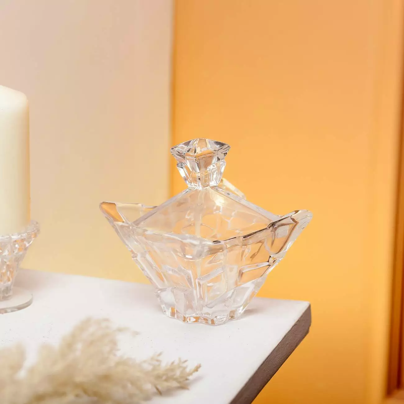 Цукорниця з кришкою Bohemiya виготовлена з прозорого товстого скла та має чітко окреслену геометричну форму. Квадратний корпус і масивна кришка з об’ємною ручкою створюють виразний візуальний акцент і водночас забезпечують зручне користування. Поверхня виконана з гранями, які при заломленні світла утворюють чіткі відблиски.