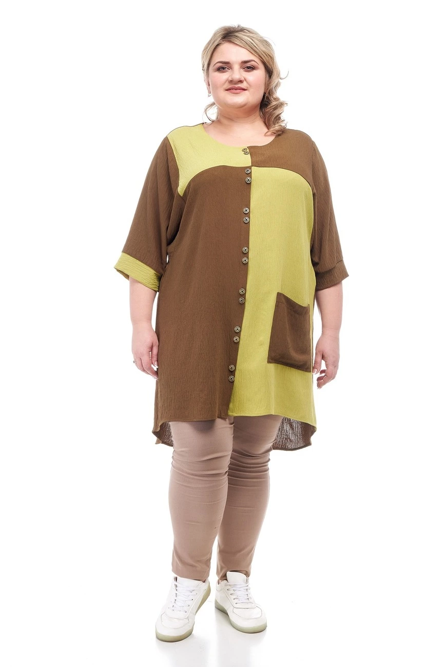 Тканина: льон -50% бавовна; 40% льон; 10% еластан. Красива, подовжена туніка, вільного силуету з тканини льон. Рукав 3/4 з підворотом, горловина кругла. Виріб на ґудзиках, спинка закруглена і подовжена, має одну накладну кишеню. Тканина гарної якості.