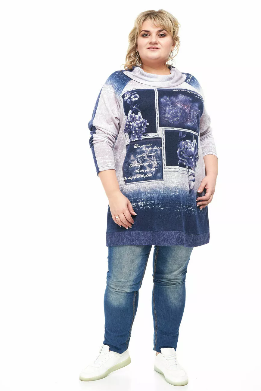 Тканина: ангора - 30% бавовна; 40% віскоза; 30% поліестер. Подовжена туніка вільного крою із тканини ангора. Рукав довгий комір хомутом. Спинка виробу однотонна - темно-синя. Тканина м'яка, тепла, приємна на дотик.