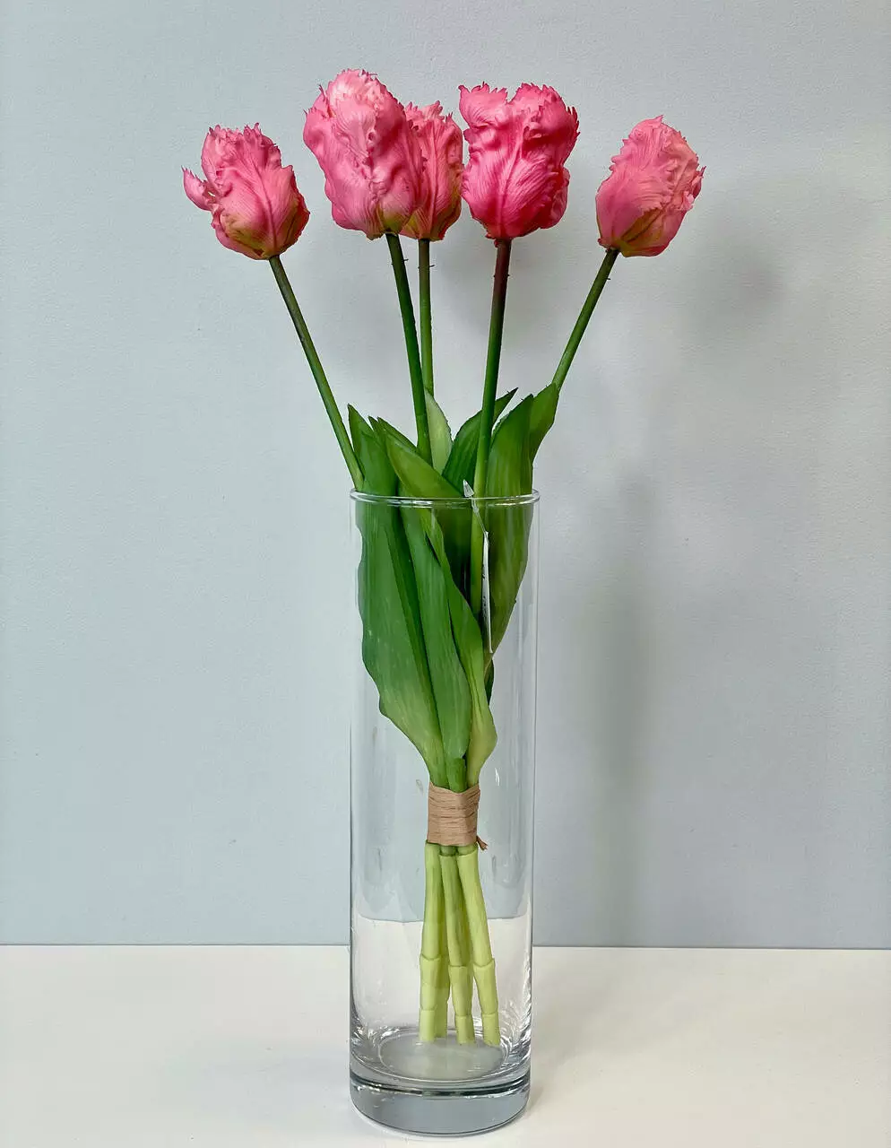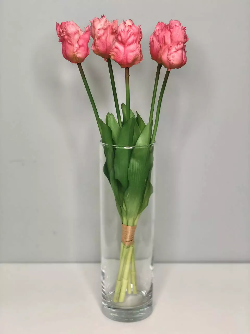 Букет складається з 5 рожевих тюльпанів. Кожна квітка має діаметр 4 см, а загальна висота букета становить 41 см. Витончені махрові пелюстки додають композиції особливої елегантності та ніжності. Стебла та листя мають природний зелений відтінок і виконані з увагою до деталей, що надає їм натурального вигляду.