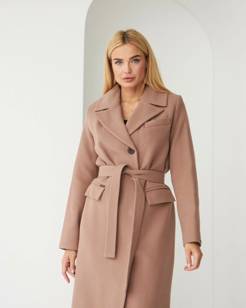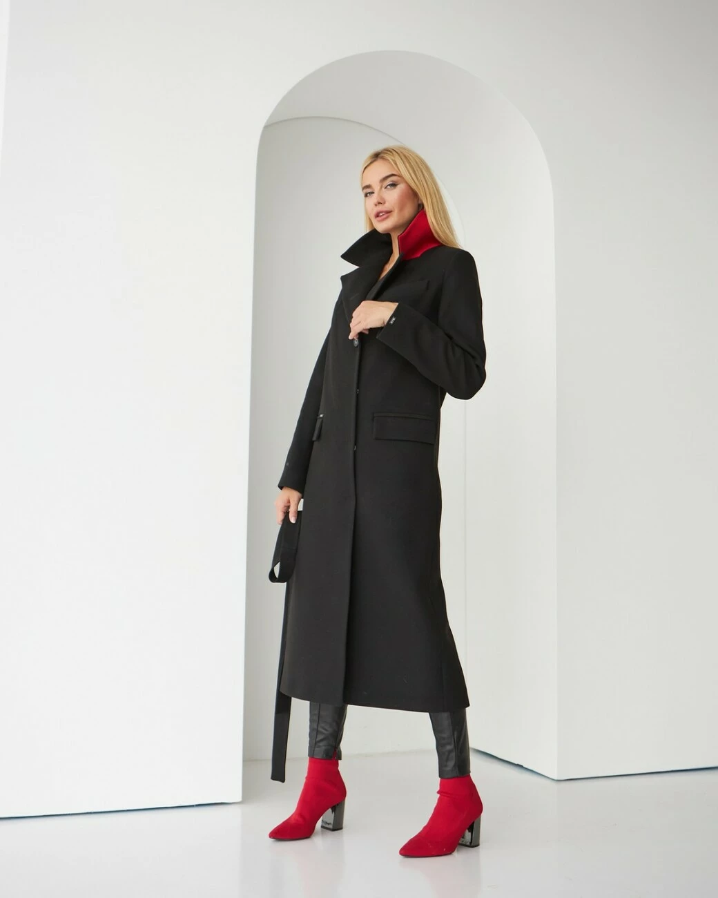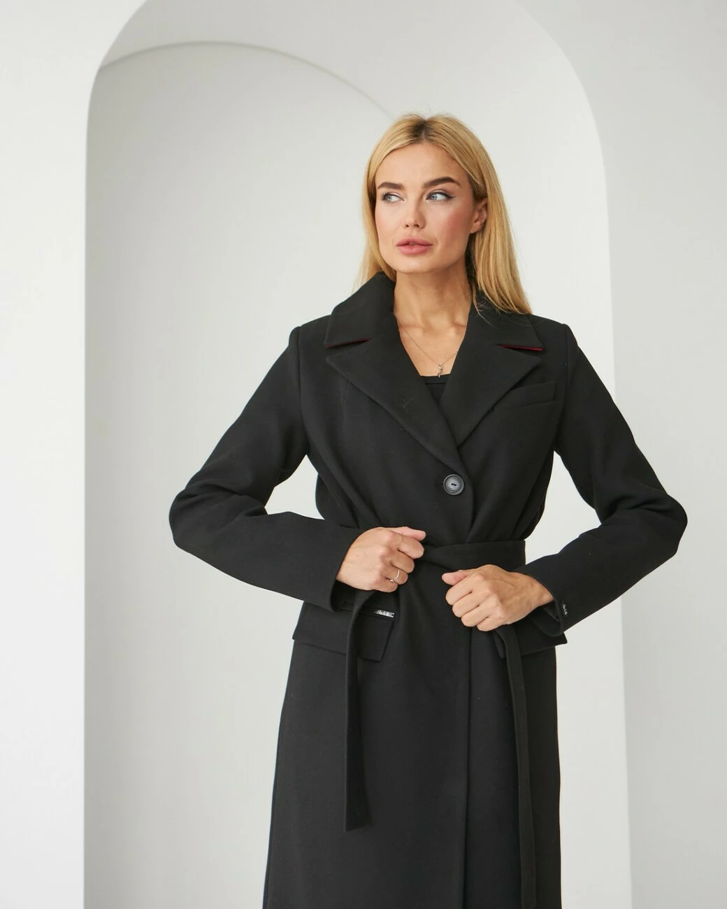 Женское удлиненное пальто прямого силуэта со шлицей сзади. В