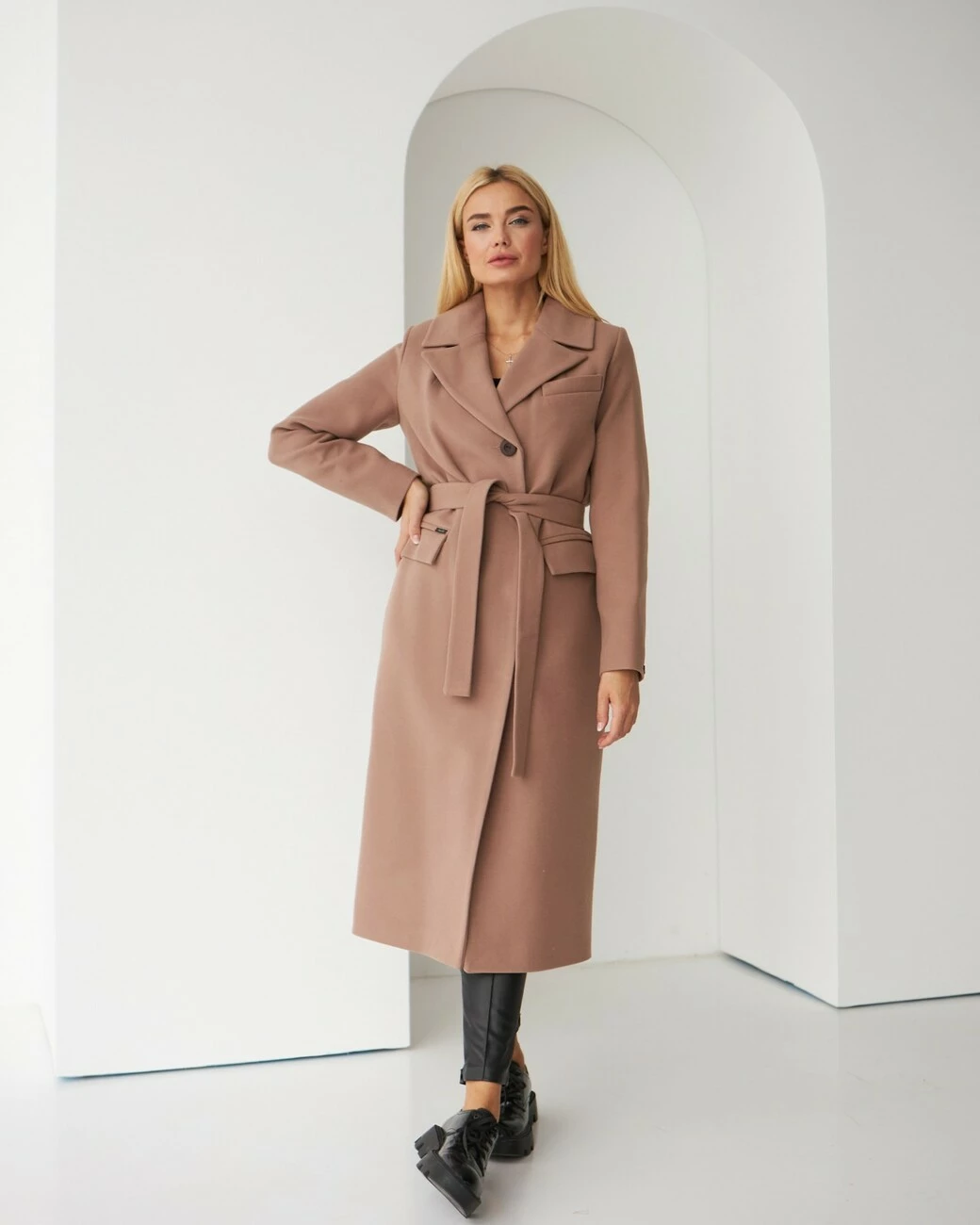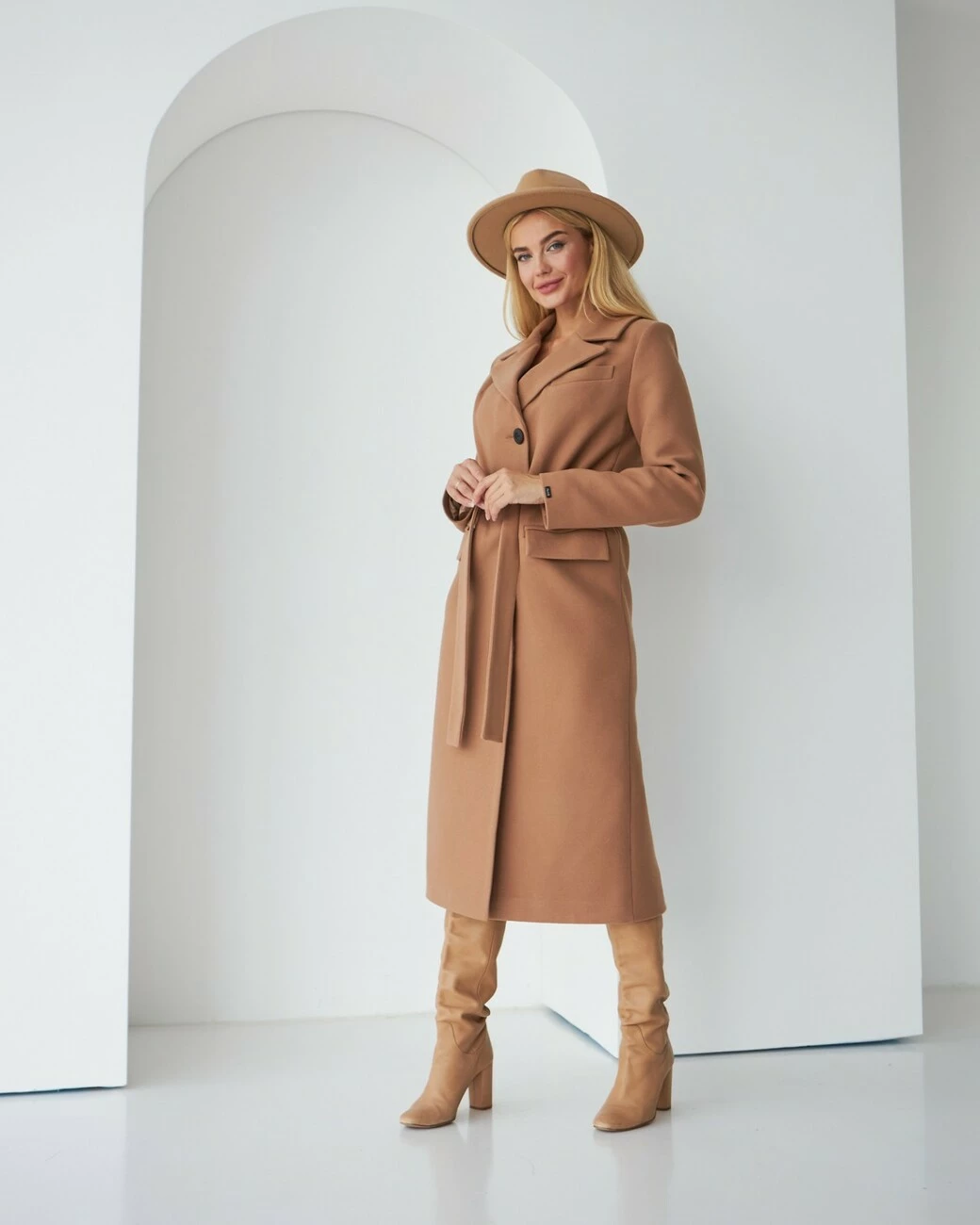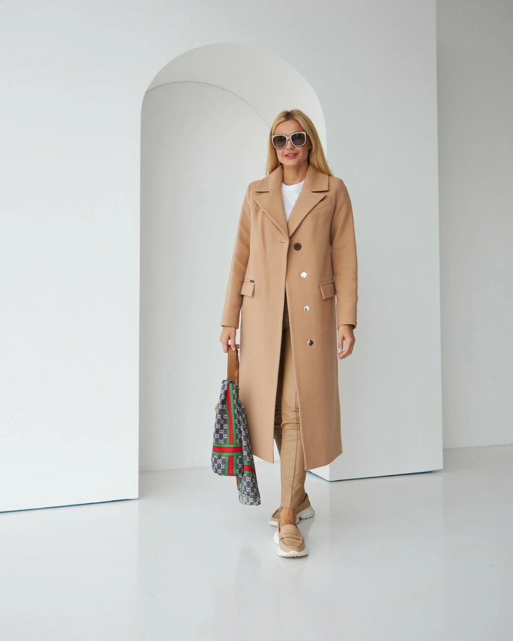 Женское удлиненное пальто прямого силуэта со шлицей сзади. В