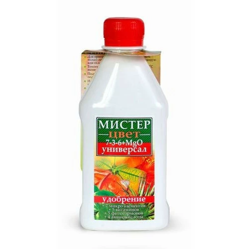 Мистер Цвет Универсал – полноценное комплексное удобрение для домашних растений. В составе – витамина, необходимые аминокислоты, стимулирующие рост фитогормоны. Удобрение Универсал – обеспечивает комнатным цветам полноценное развитие, гармоничный рост, хорошее цветение и чистый красивый лист.