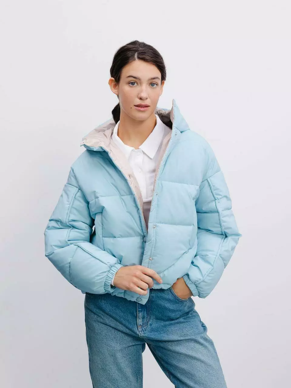 Додайте стильного тепла до вашого зимового гардеробу з цією укороченою світло-блакитною стьобаною курткою. Виготовлена зі штучним пухом, вона забезпечує чудовий захист від холоду, залишаючи при цьому відчуття легкості та комфорту. Контрастна підкладка додає елегантного акценту, роблячи куртку ще привабливішою.