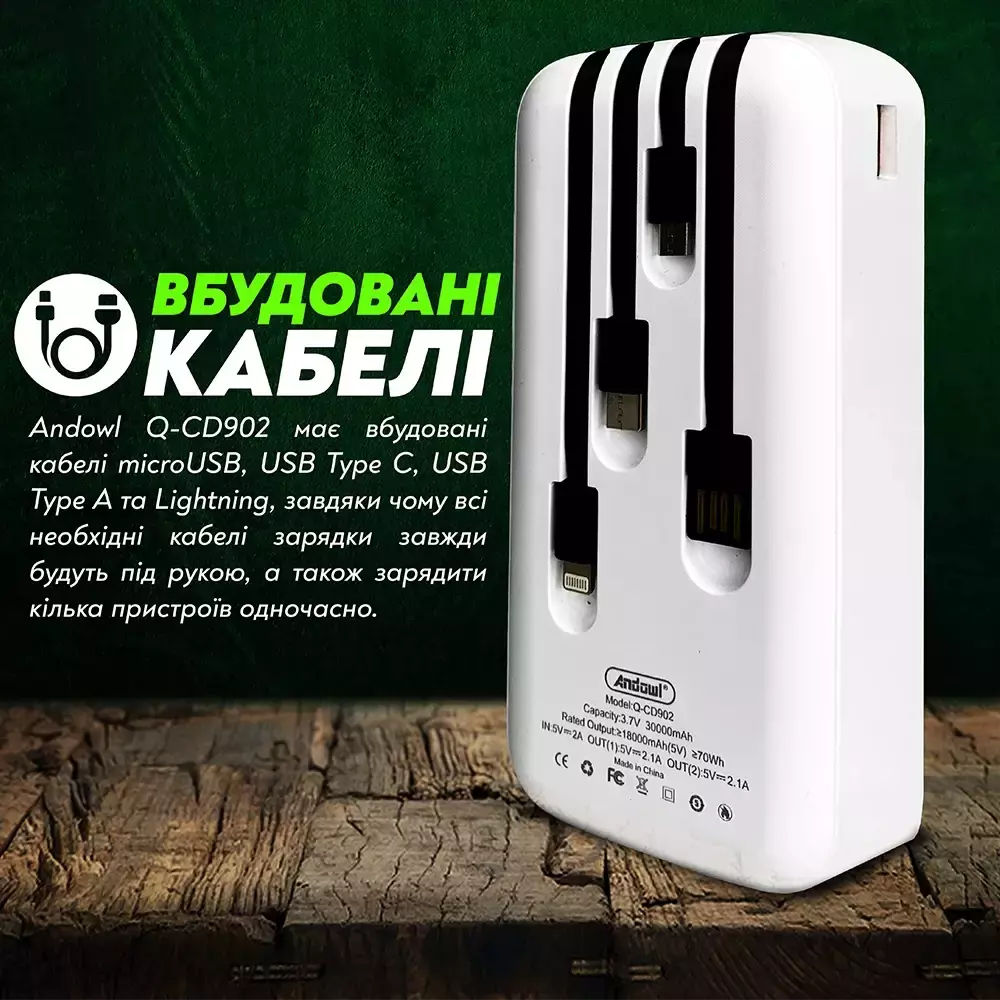 • Встроенные кабели. Andowl Q-CD902 имеет встроенные кабели microUSB, USB Type C, USB Type A и Lightning, благодаря чему все необходимые кабели зарядки будут всегда под рукой, а также зарядить несколько устройств одновременно.