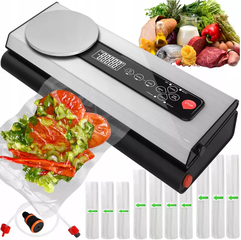 • МАШИНКА ДЛЯ ВАКУУМНОЙ УПАКОВКИ С ВЕСАМИ это необыкновенное, интуитивно понятное устройство, благодаря которому овощи, фрукты, мясо, рыба, мясное ассорти и молочные продукты будут долго оставаться свежими . Продукты питания, хранящиеся в вакууме , не подвергаются воздействию бактерий и плесени . При этом он сохранит свой вкус и запах не смешается с другими продуктами в холодильнике. Благодаря тому, что в устройство встроены весы, мы можем порционировать продукты перед тем, как завернуть их в специальную фольгу . Исключительно простая эксплуатация фольгированного запайщика означает, что для его использования не потребуются какие-либо специальные навыки.