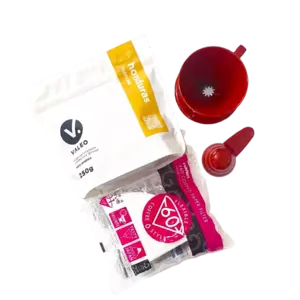 Набор для приготовления кофе альтернативым способом. В наборе кофе specialty Honduras Marcala (очень яркий на вкус, ноты горького шоколада, персика и карамельных конфет); пуровер Hario V60, очень удобный и практичный аксессуар для приготовления кофе; бумажные белые фильтры для пуровера.