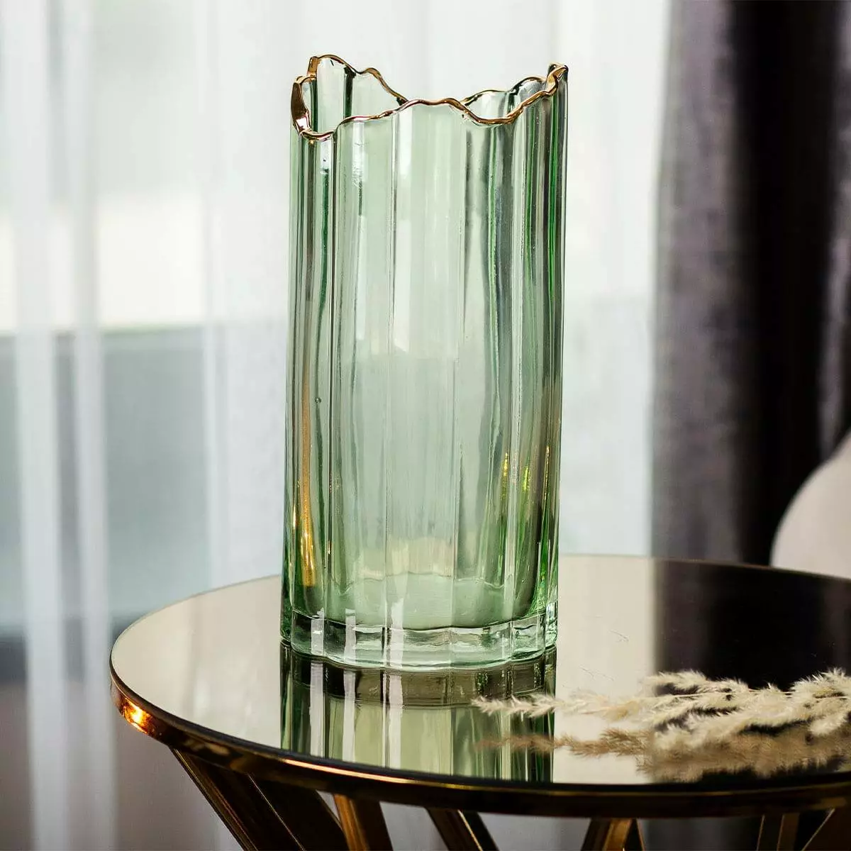 Декоративна ваза Glass Flower — це стильний і витончений елемент декору, виконаний у формі бутона квітки. Виготовлена зі скла, вона має висоту 24,5 см і зелений колір, що додає їй сучасного та елегантного вигляду. Золотий обідок надає вазі вишуканості та робить її ефектним акцентом у будь-якому інтер'єрі. Форма бутона підкреслює витонченість дизайну, роблячи вазу не лише функціональним, а й декоративним елементом.
