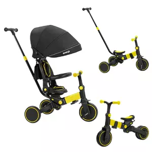 Швидко збирається без інструментів. Компактно складається в декілька рухів. Легко конвертується у біговел. Великий капюшон з трьома секціями та із світловідбивною стрічкою; Батьківська ручка з регуліровкою по висоті; Триточкові ремені безпеки; М'яка спинка з регулюванням нахилу; Сумочка для дрібниць на 3 секції Зносостійкі PU колеса (15 см задні, 18 см переднє); Підніжка. Максимальне навантаження: 25 кг Розміри ящика - 69,5 * 20,5 * 34,5см