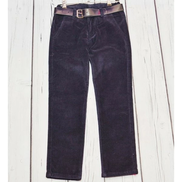 Благодаря большому количеству ворсинок вельвет лучше других материалов удерживает тепло тела и имеет очень приятную структуру с характерным богатым блеском. Благодаря визуальной обьемности и уютности ткани вельветовые штаны удачно сочетаются как с классическими однотонными рубашками и джемперами, так и с теплыми свитерами, украшенными интересным принтом. Для того, чтобы изделие хорошо сидело в талии к брюкам прилагается ремень, выполненный в градиенте оттенков фиолетово-синего цвета. Данное сочетание цветов и аксессуаров создает привлекательный стильный образ, в котором ребенок сможет пойти как на обычную прогулку, так и на день рождения к другу.
