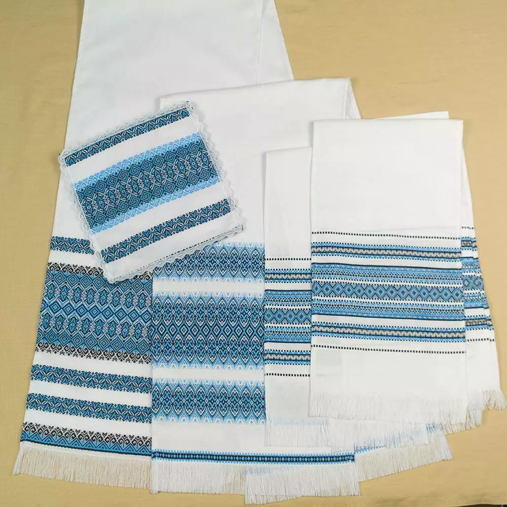 Рушники і серветка с тканим синім орнаментом. Орнамент зроблений з акрилових  ниток, що надає їм святкового вигляду. Тканий орнамент зблизька виглядає як вишивка гладдю, а по ціні набагато доступніше.