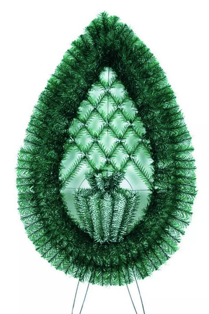 Вінок зі штучної хвої у формі щита, по центру заплетений решіткой, к низу зібраний в вазу з додаванням кольорової хвої, розмір 130*80*17 см.