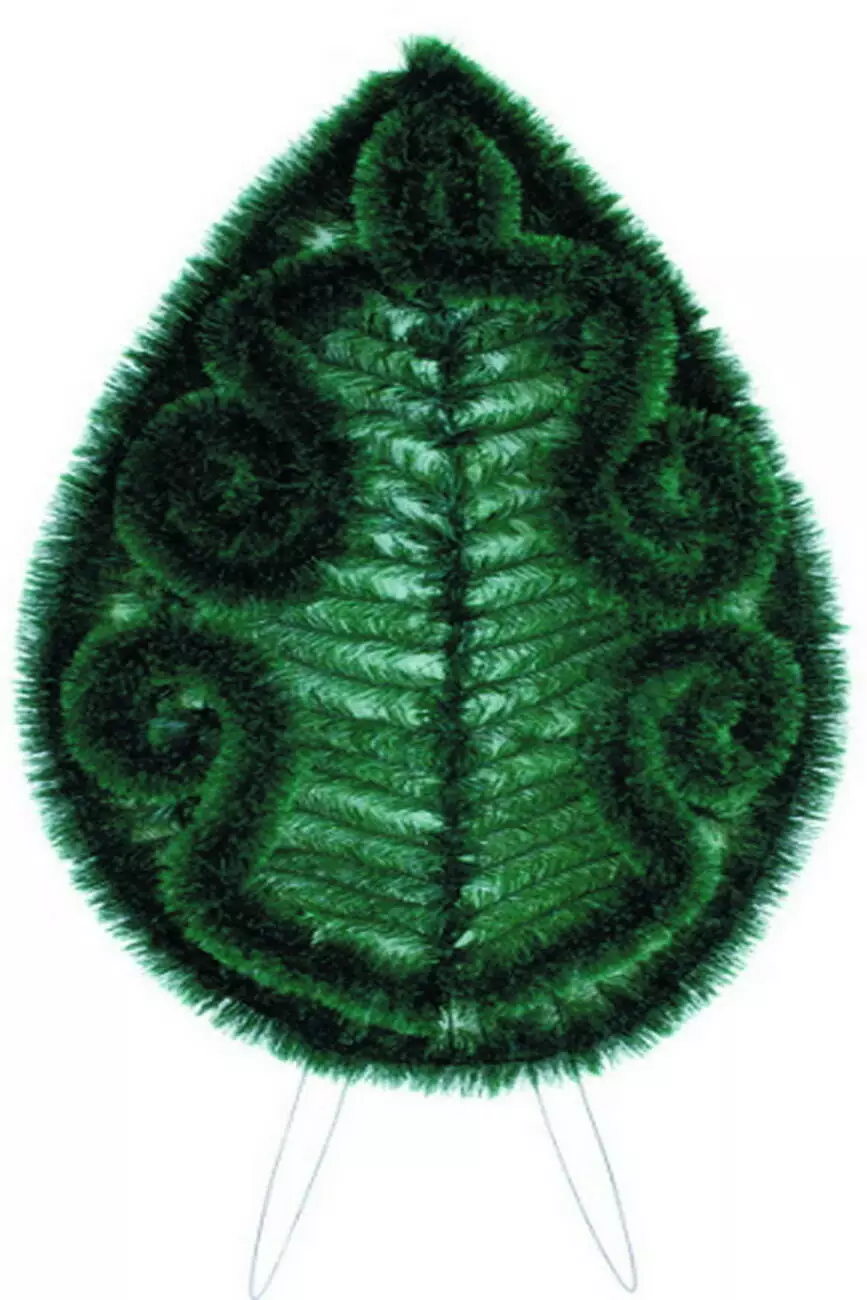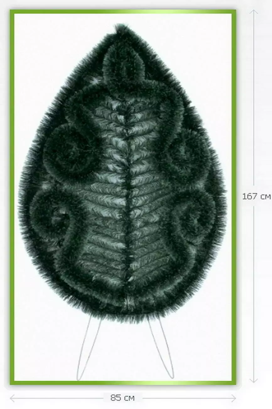 Вінок зі штучної хвої у формі щита, зашитий по центру горизонтальною хвоєю, по краю з йоршом, розмір 167*85*23 см.