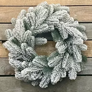 Декоративний різдвяний вінок виготовлений з переплетених гілок штучної ялинки. Він виготовлений з 100% литої хвої, а його голочки нагадують живу ялинку, але вони більш м'які та не колючі. Об'ємне густе напилення на вінку, реалістично імітує сніг, який тільки що впав на гілки пухнастими пластівцями. Матеріалом розпилення є натуральна бавовна, він екологічний і не має запаху, безпечний для дітей і дорослих.
