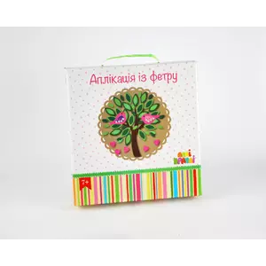 На оборотній частині коробки вказана покрокова інструкция. Не забувайте по закінченню роботи покласти аплікацію під щось важке для остаточної фіксації фетру. Для напівперлин краще підходить гарячий клей або клей миттєвого висихання. Для безпеки юних майстрів, в наборі немає даного клея.