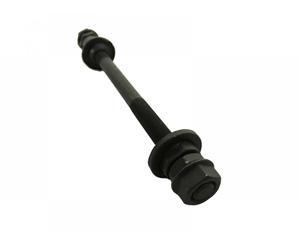Вісь задня для гірських велосипедів в зборі з конусами і пиляками. Чорного кольору.