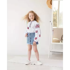 Вишита блуза для дівчинки на довгий рукав “ Трояндочки”. Стильна вишиванка білого кольору з кутасиками, комір-стійка, виготовлена з сорочкової тканини-поплін. Блуза прикрашена квітковим візерунком червоного кольору. Квітковий орнамент символізує сонце, теплоту та добро, яке випромінює людина. А червоні нитки символізує любов до людини, життя, енергію, радість. Саме для дівчаток підбирають такі гарні кольори та орнамент. Класична вишиванка підкреслить будь-який образ, а також кожна дівчинка буде відчувати себе по особливому на святі. Придбати вишиваночки можна у нас в інтернет-магазині "Меланіка"!