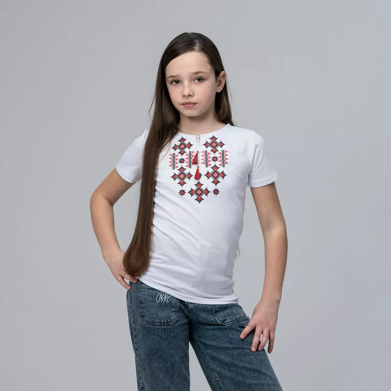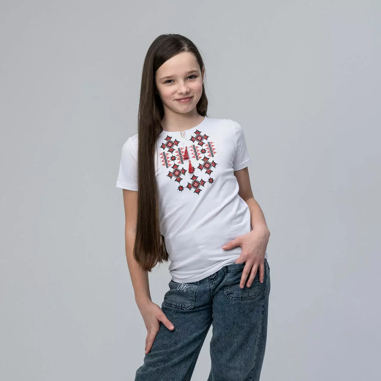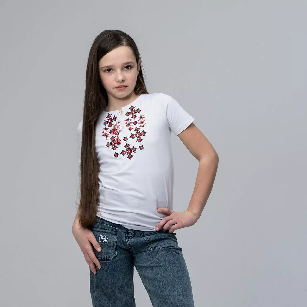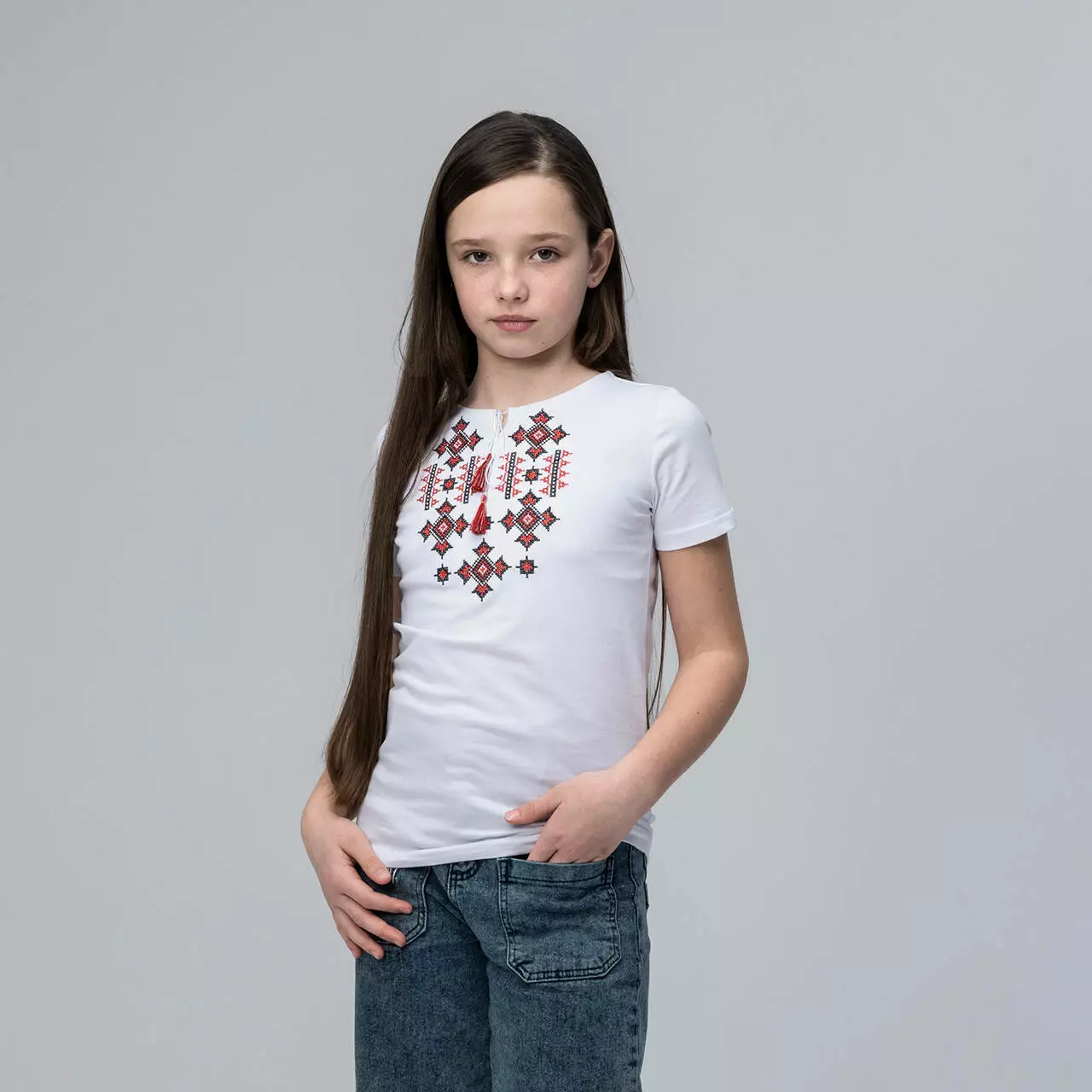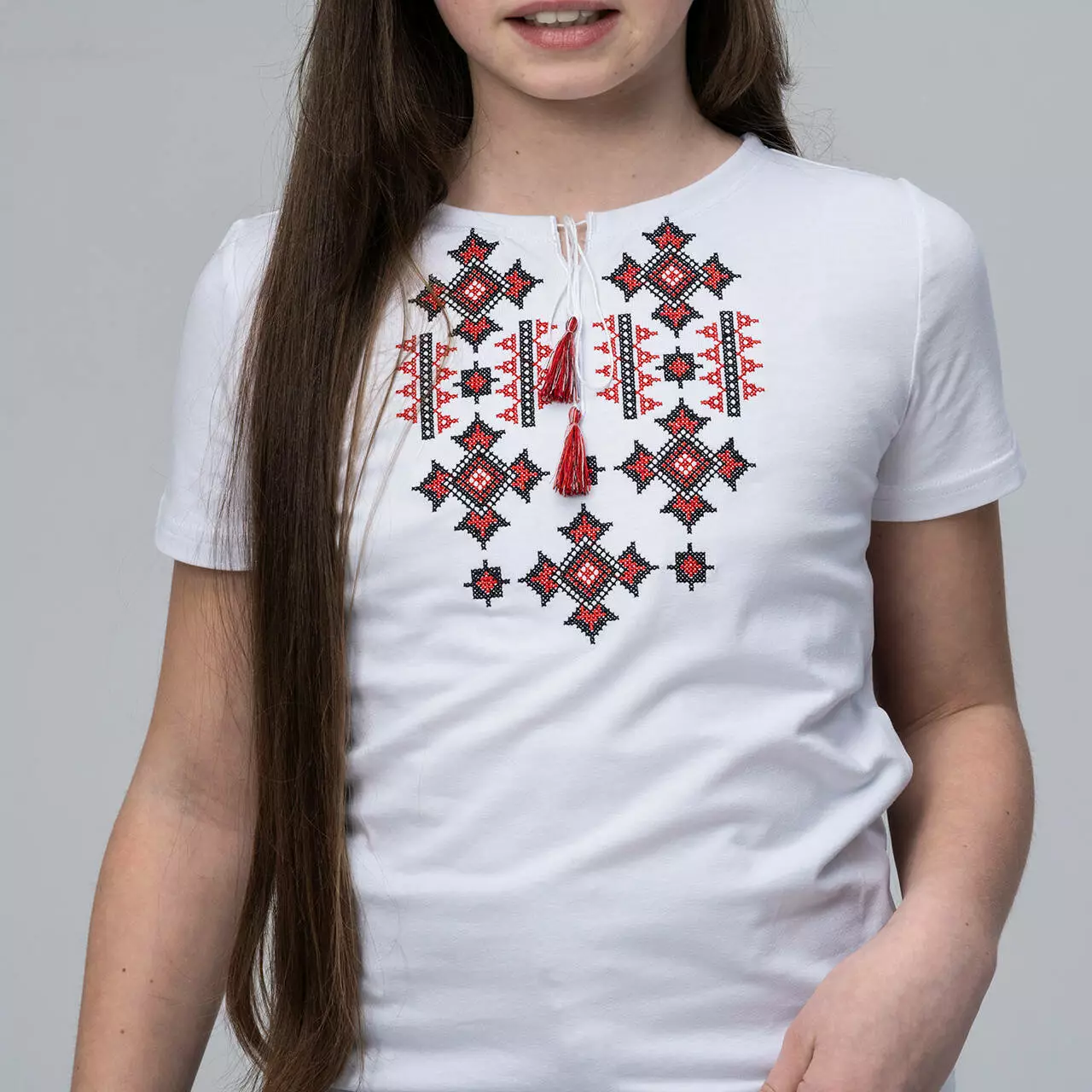 Вишита футболка для дівчинки "Зоряне сяйво". Футболка літня білого кольору з геометричним орнаментом та прикрашена кутасиками. Виготовлена з натуральної бавовни, яка приємна та ніжна на дотик, зберігає прохолоду в спекотні літні дні. Геометричний візерунок сімволізує досконалість, порядок, гармонію, які потрібні для кожної дівчинки. А чорні та червоні нитки характеризують любов,сонце, радість, добробут та багатство. Така вишита футболка прикрасити вашу дівчинку для важливої події, шкільних святкувань. У нашому інтернет-магазині "Меланіка" можна придбати вишиваночки на будь-який смак!