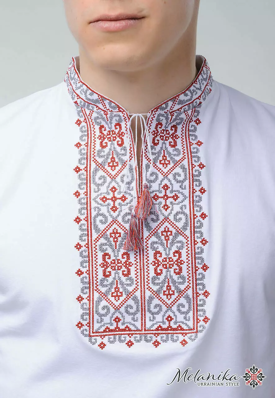 Зверніть увагу на вишитий візерунок. Геометричний орнамент дуже гарно та гармонійно дивиться на білій тканині. Він виконаний вишневими нитками. Кожен стібок максимально рівномірний, тому не розповзеться при найменших ушкодженнях.