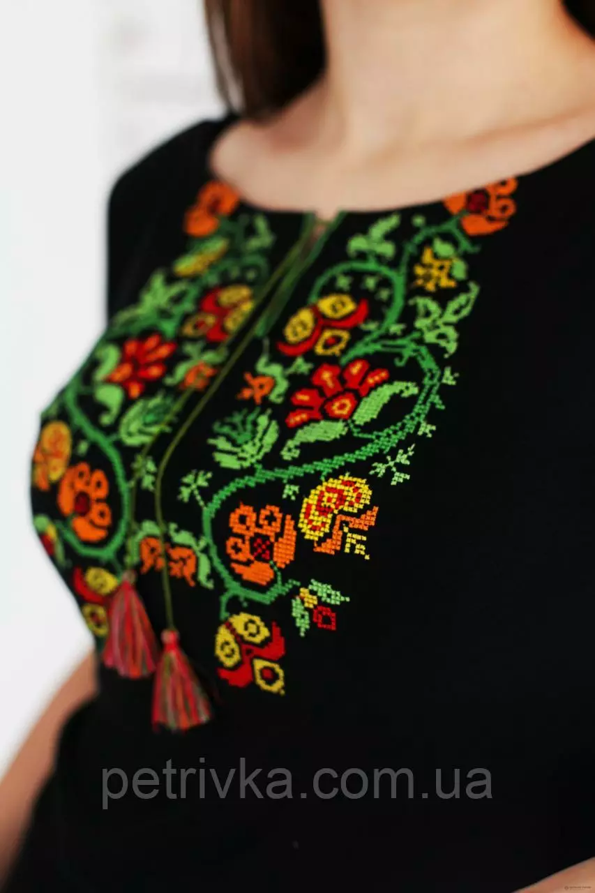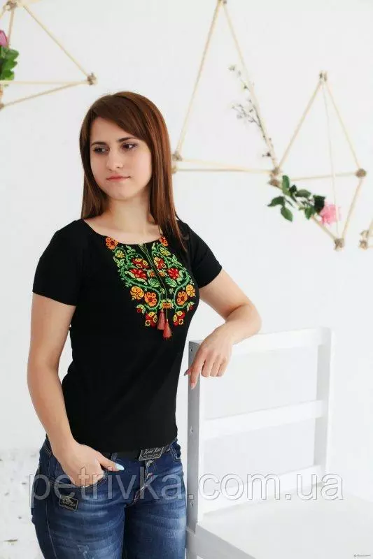 Чорна вишита футболка, техніка вишивки хрестик. На футболці гарне