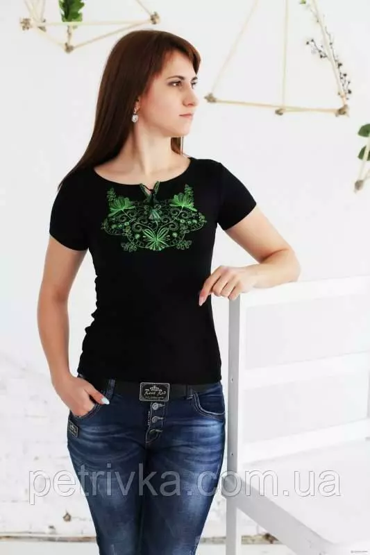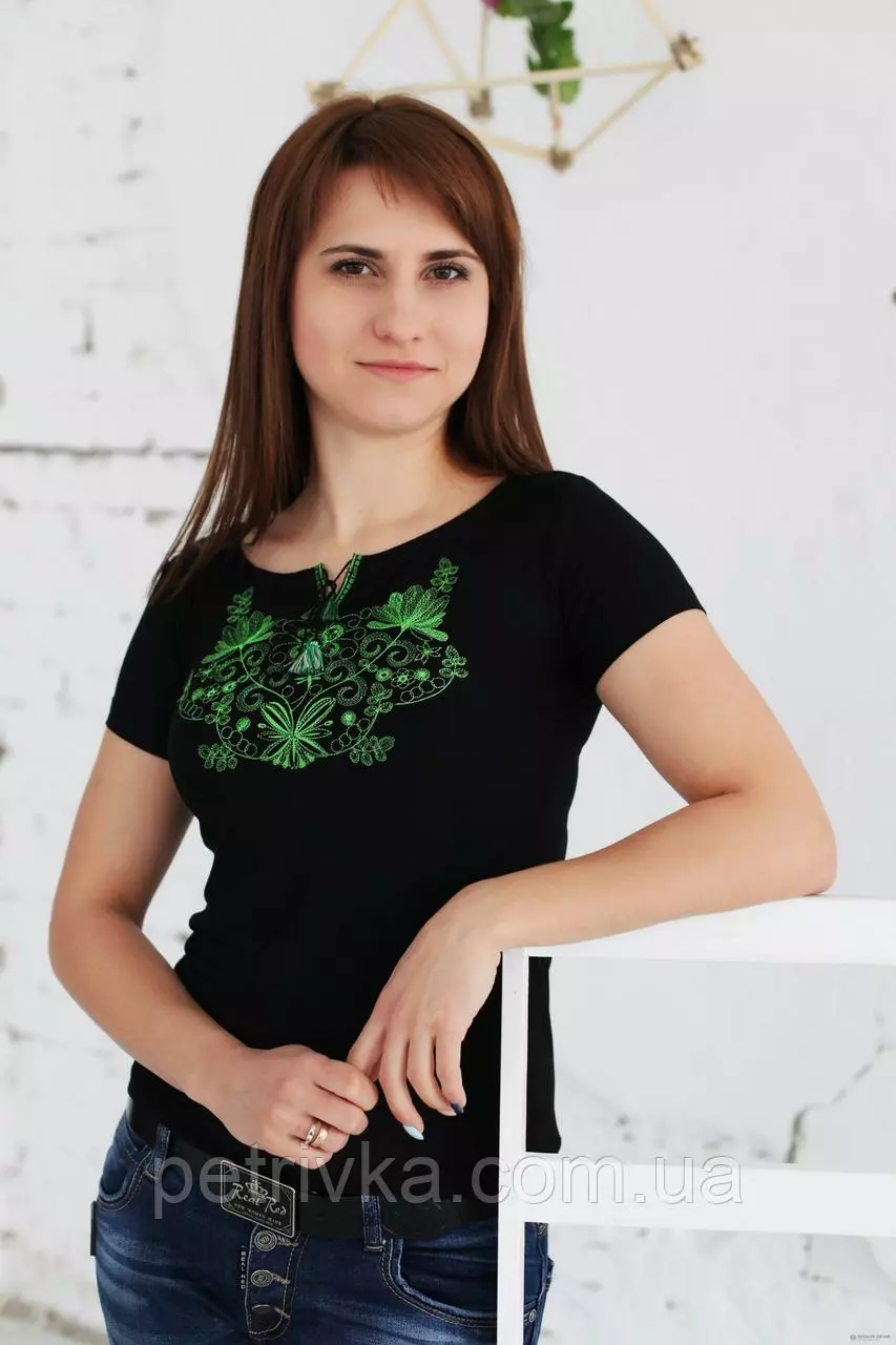 Футболка з вишитими зеленими нитками узорами, Весна А-5