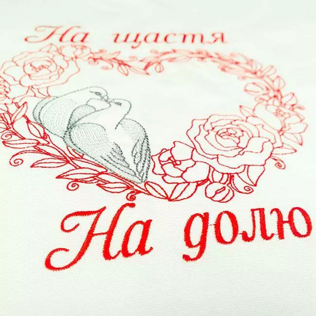 Тканий рушник "На щастя, на долю" по центру містить красиву вишивку, виконану в техніці "машинна гладь". Голуби вишиті блискучими нитками.