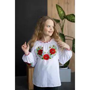 Дитяча вишиванка на довгий рукав "Маків цвіт" - це чудовий вибір для батьків. Вишиванка із рукавом реглан та круглою горловиною ідеальний одяг для свят у школах або дитячому садочку. Модель прикрашена квітковою вишивкою: великими маками та волошками на рукавах та грудях. Вишита сорочка виготовлена із сорочкової тканини, яка легка у догляді та використанні. Для виразності горловина та манжети на рукаві прикрашені червоним контуром, який захищає вашу дитину.