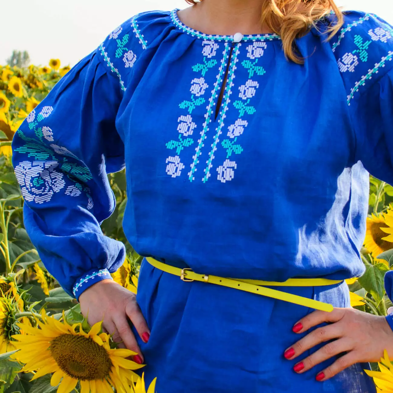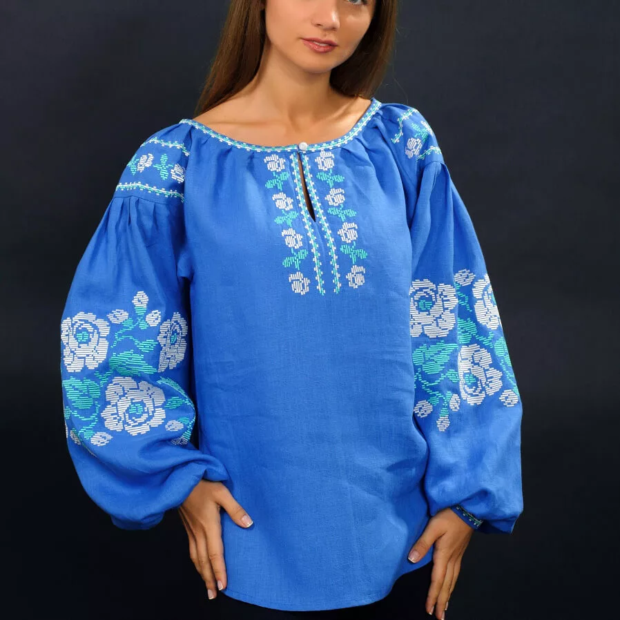 Жіноча вишиванка, вишита яскравими синьо-білими нитками