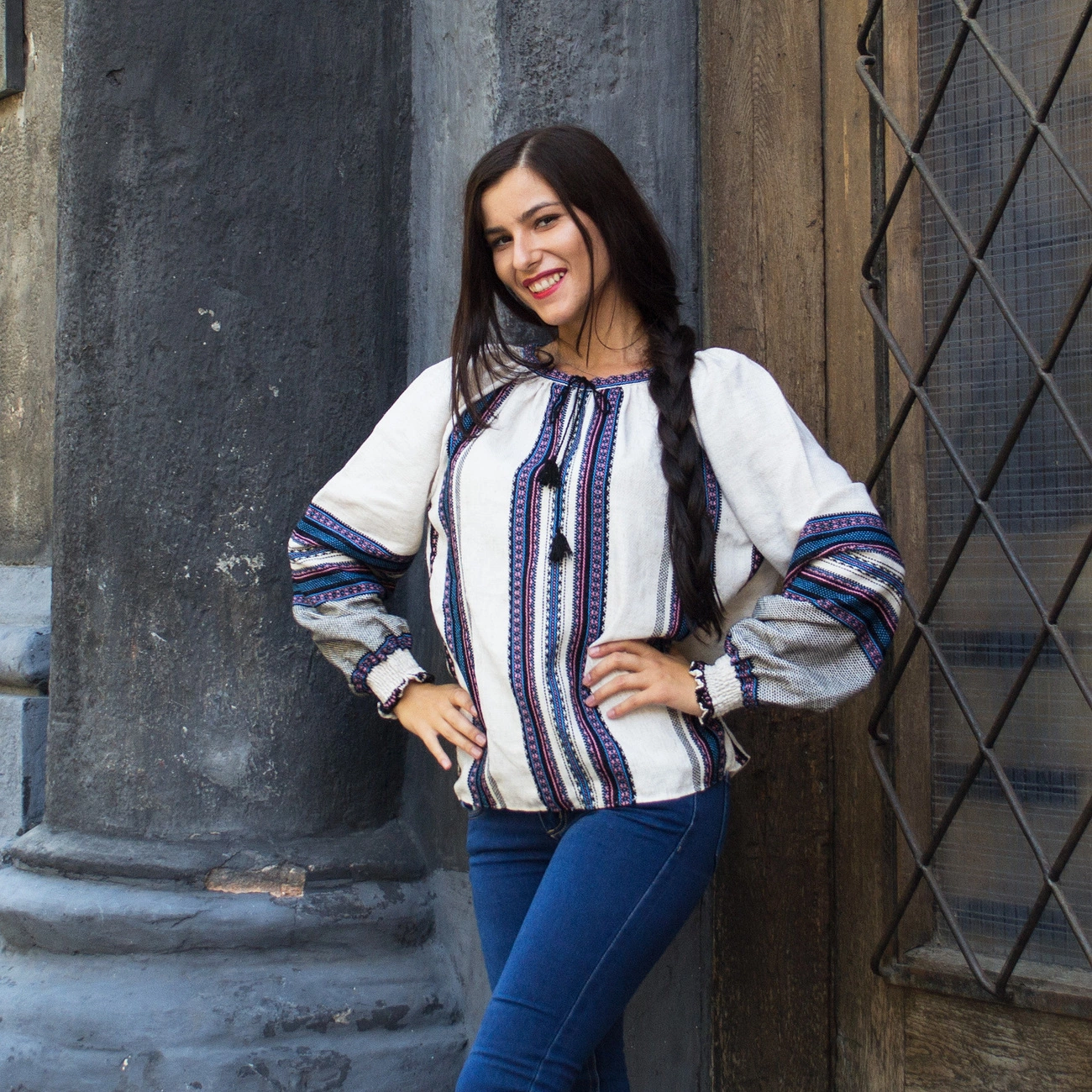 Жіноча вишита сорочка, виконана на сірому тканому полотні