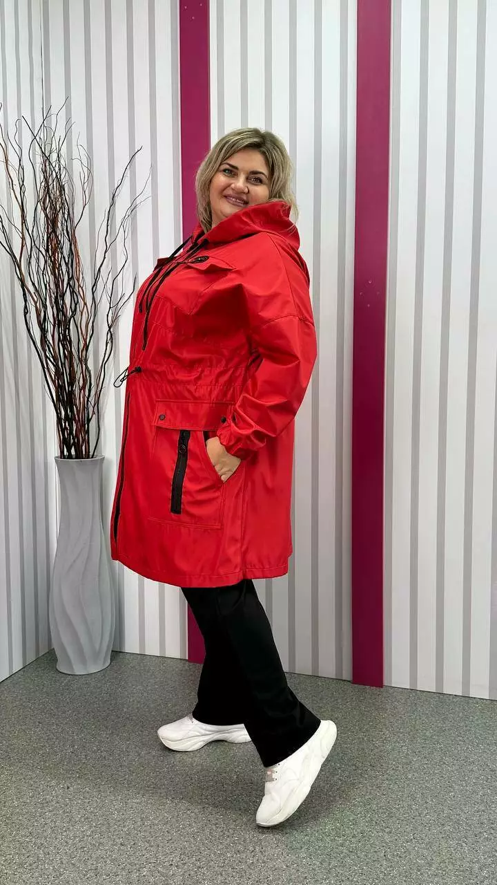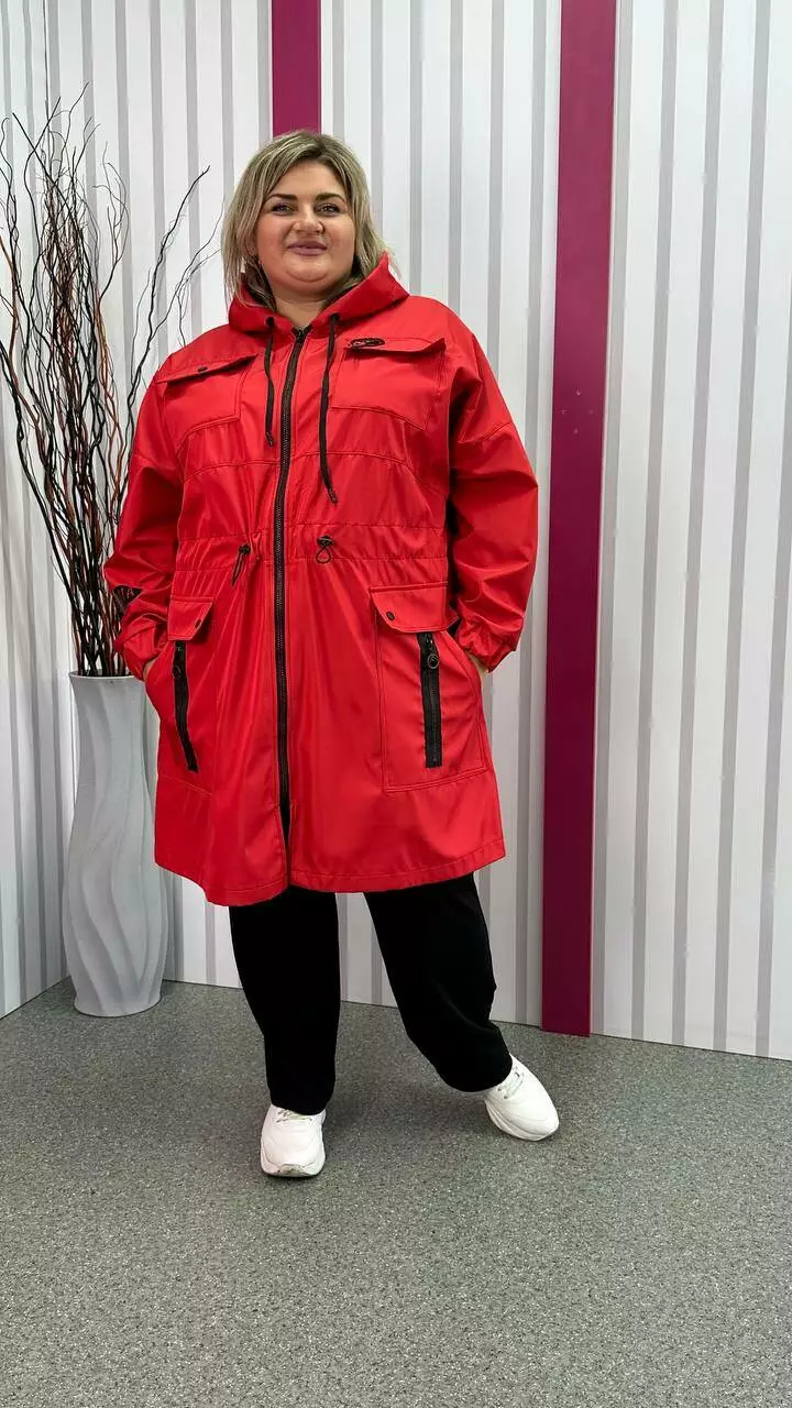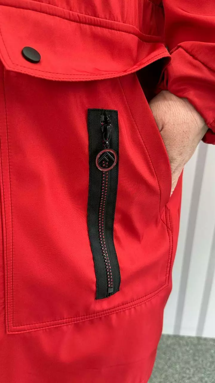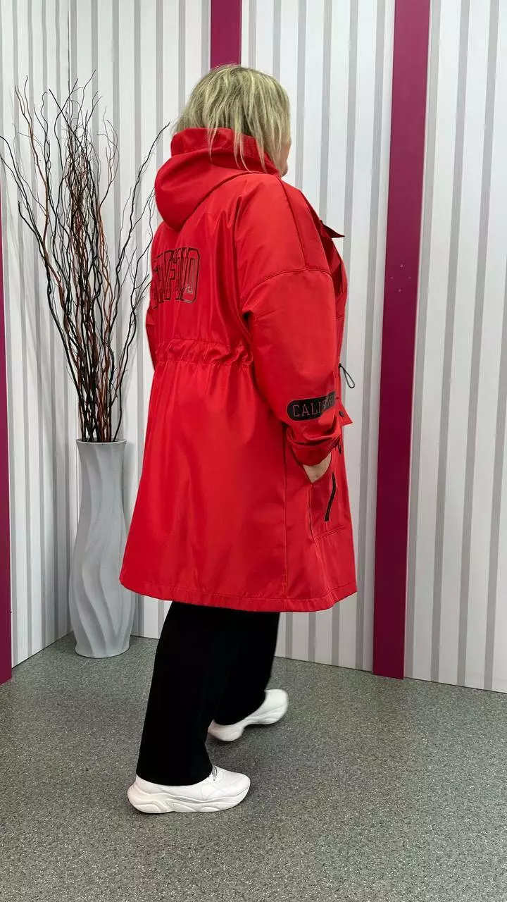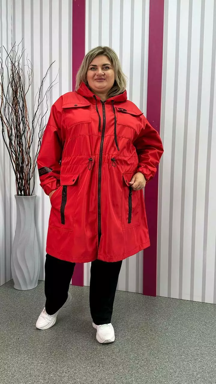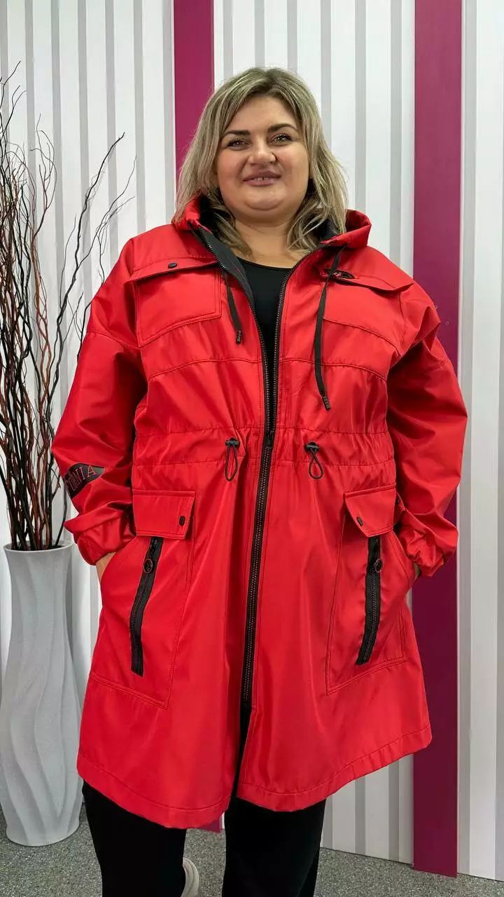 Тканина щільна, не пропускає вітер та воду, тримає форму, дуже гарної якості. Фасон вільний, талія регулюється лаштунками, по грудях оверсайз, спущене плече, манжет на гумці. Кишені накладні, з капюшоном. Прикрашена якісним накатом.