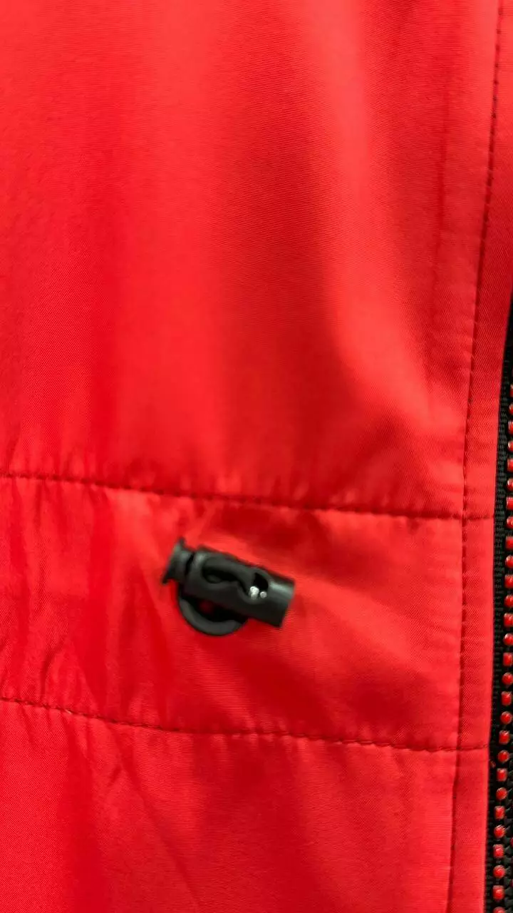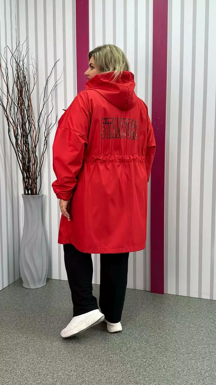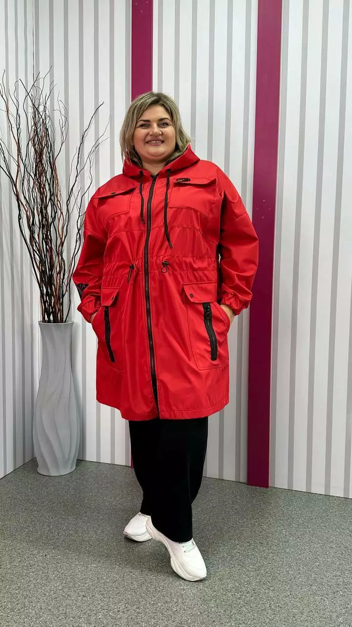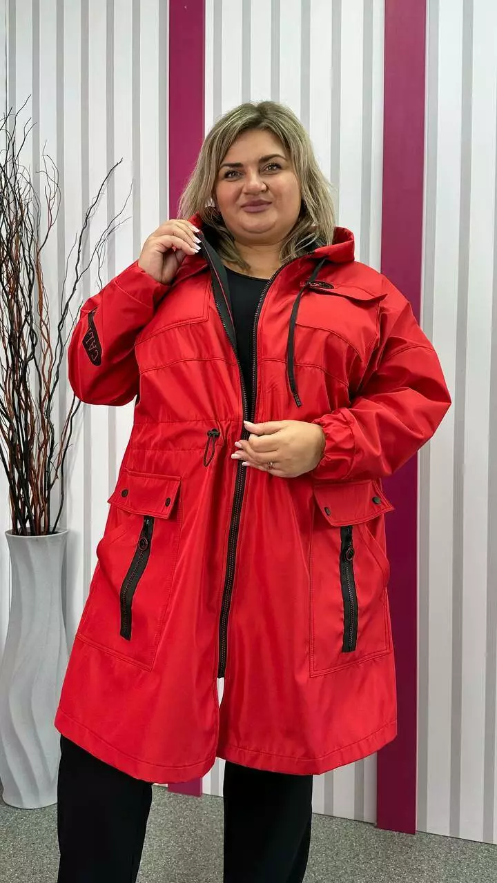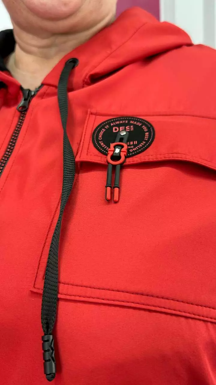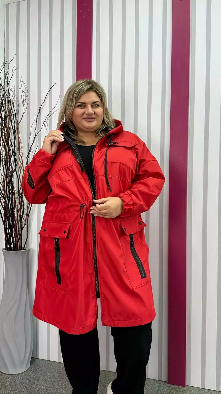 Тканина щільна, не пропускає вітер та воду, тримає форму, дуже гарної якості. Фасон вільний, талія регулюється лаштунками, по грудях оверсайз, спущене плече, манжет на гумці. Кишені накладні, з капюшоном. Прикрашена якісним накатом.